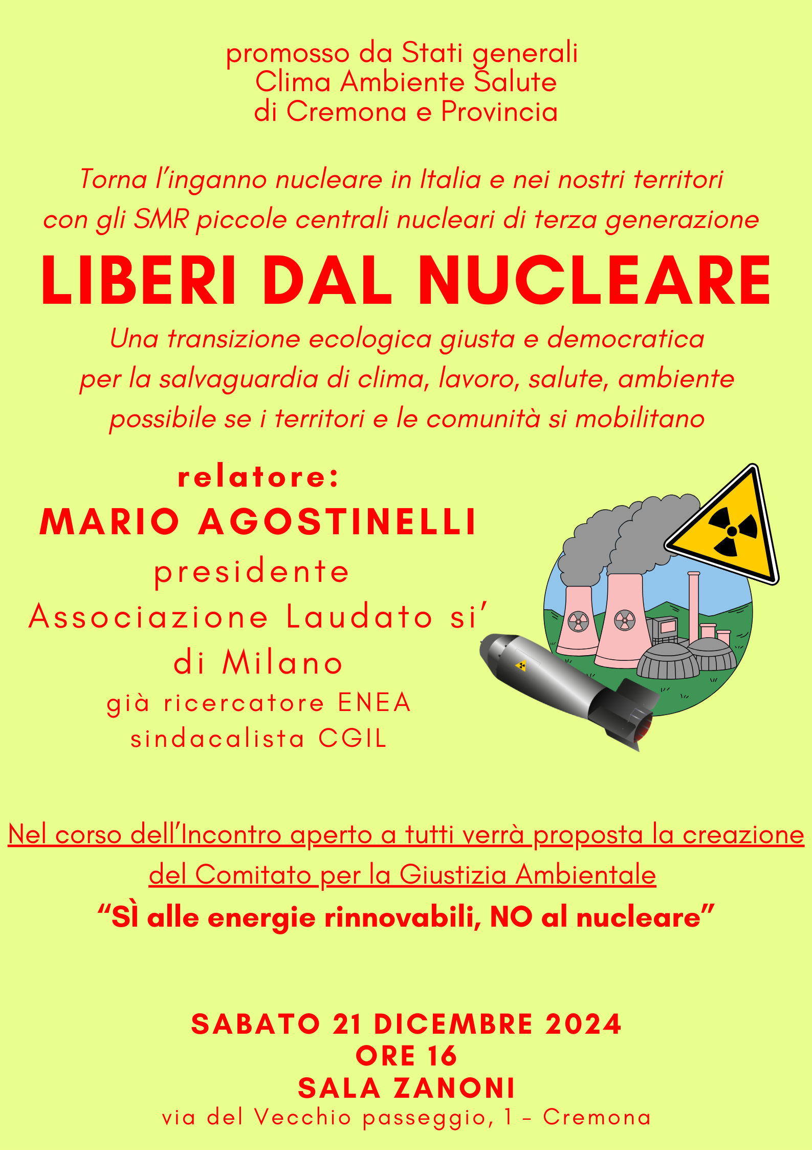 Sabato 21 dicembre alle 16 in sala Zanoni a Cremona prende il via la campagna “ Liberi dal Nucleare”, che si svilupperà sul territorio nei prossimi mesi per dire No alle centrali nucleari anche di piccola taglia e Sì ad un programma di più forte impulso alle energie rinnovabili alternative sia al nucleare che alle fonti fossili.