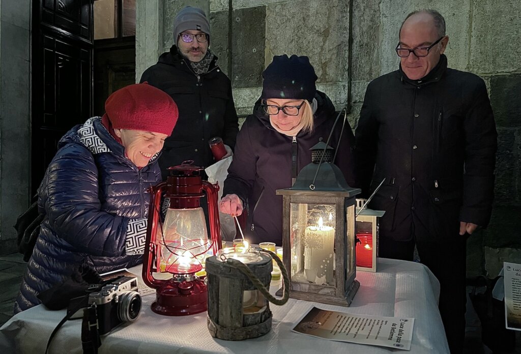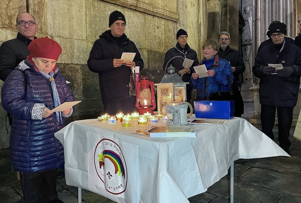 Dopo la preghiera in San Gerolamo, la Luce della Pace di Betlemme è stata spostata sotto i portici della Cattedrale per essere distribuita con ceri e lampade ai presenti, unitamente al suo messaggio. Non è mancata la partecipazione del Vescovo, mons. Antonio Napolioni, che poi ha portato la fiamma nel massimo tempio cittadino.