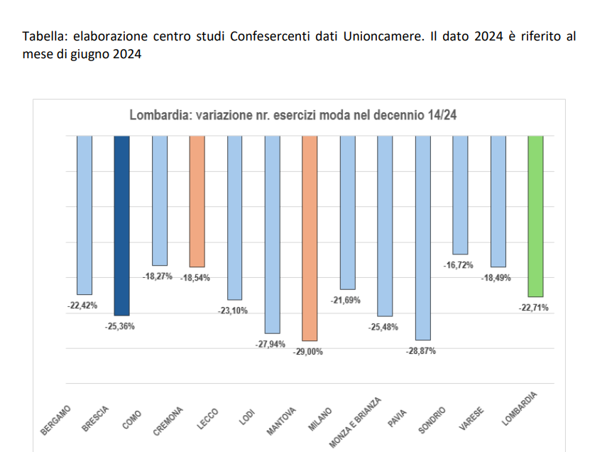 Inoltre, secondo una elaborazione del centro studi Confesercenti su dati Unioncamere, negli ultimi 10 anni Cremona ha perso quasi 1 impresa di moda su 5 (-71, pari al -18,54%).