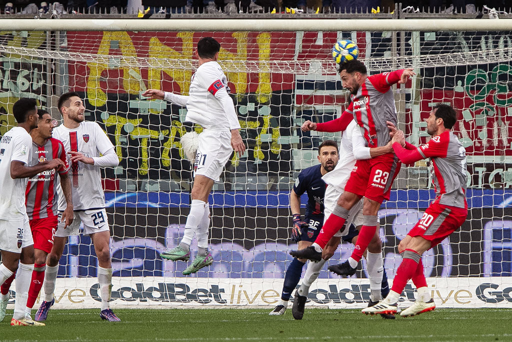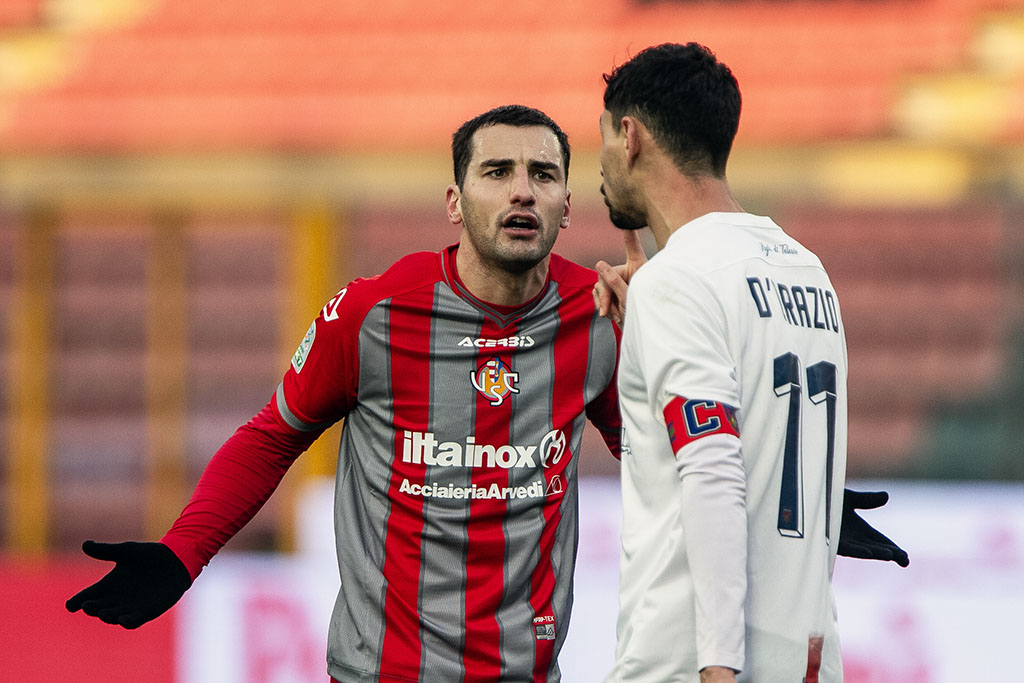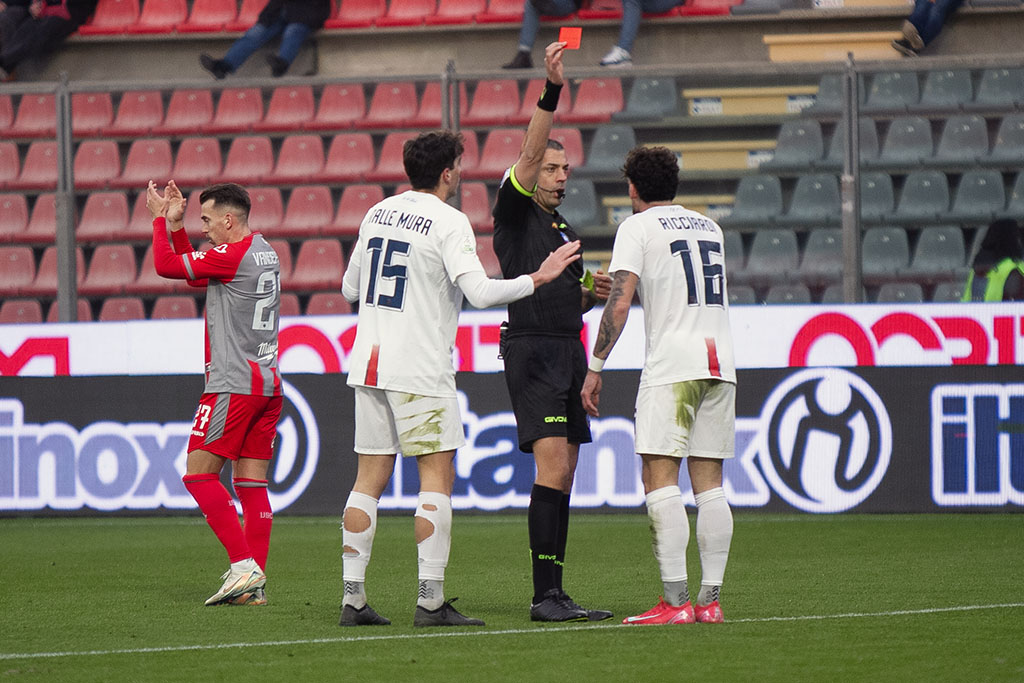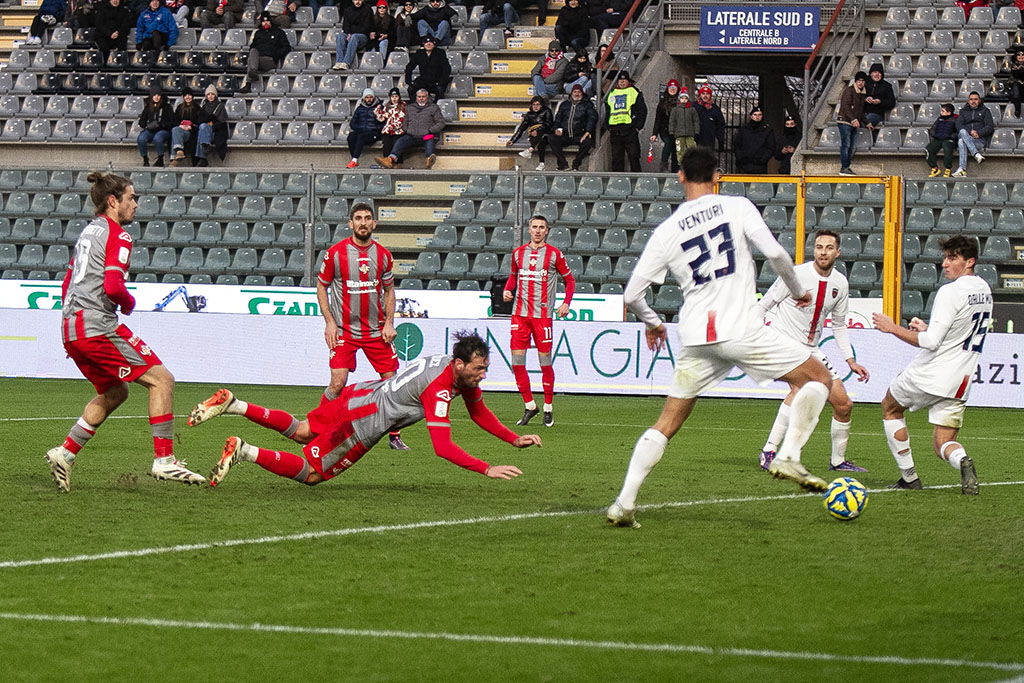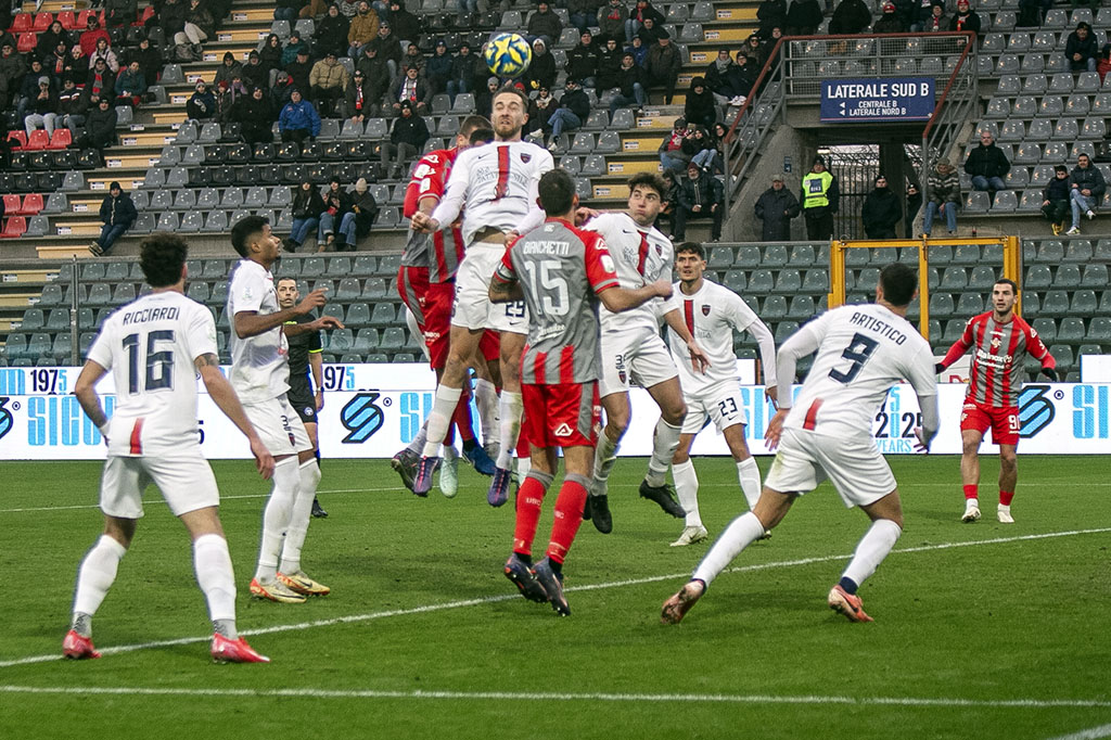 La Cremo parte forte. Al 3′ sponda di testa di Antov per Bonazzoli che prova la girata col mancino, Micai blocca. All’11′ punizione tagliata di Rizzo Pinna, Fulignati respinge. Al 17′ Bianchetti rimedia un cartellino giallo che non gli consentirà di scendere in campo domenica prossima contro il Modena. Sul calcio di punizione, da ottima posizione, di Rizzo Pinna, la barriera respinge in angolo. Al 23’ la Cremo la sblocca: cross perfetto di Vandeputte, sul secondo palo Pickel mette dentro con un preciso colpo di testa e sblocca l’incontro. Due minuti dopo Rizzo Pinna calcia colpendo il palo, il rimpallo favorisce Ricciardi che si fa trovare pronto sul secondo palo e con un tiro d’interno piede batte Fulignati. L’arbitro prima annulla la rete per fuorigioco, poi, dopo check del Var, il gol viene convalidato. Al 29’ cartellino giallo anche per Collocolo, che salterà la prossima gara. Al 38′ Vazquez calcia di prima intenzione verso la porta di Micai, ma Artistico respinge di testa quasi sulla linea di porta. Poco dopo palla perfetta di Collocolo, Vandeputte sbuca sul secondo palo, ma Sgarbi salva tutto con un intervento in scivolata miracoloso.