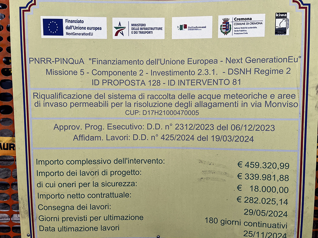 L’opera, che avrà un costo complessivo di 460mila euro, risponde all’esigenza di ridurre o addirittura eliminare gli allagamenti del sottopasso ferroviario di via Monviso, a fronte del fatto che la rete fognaria non è in grado di smaltire le portate di punta in occasione di eventi meteorici di media intensità.