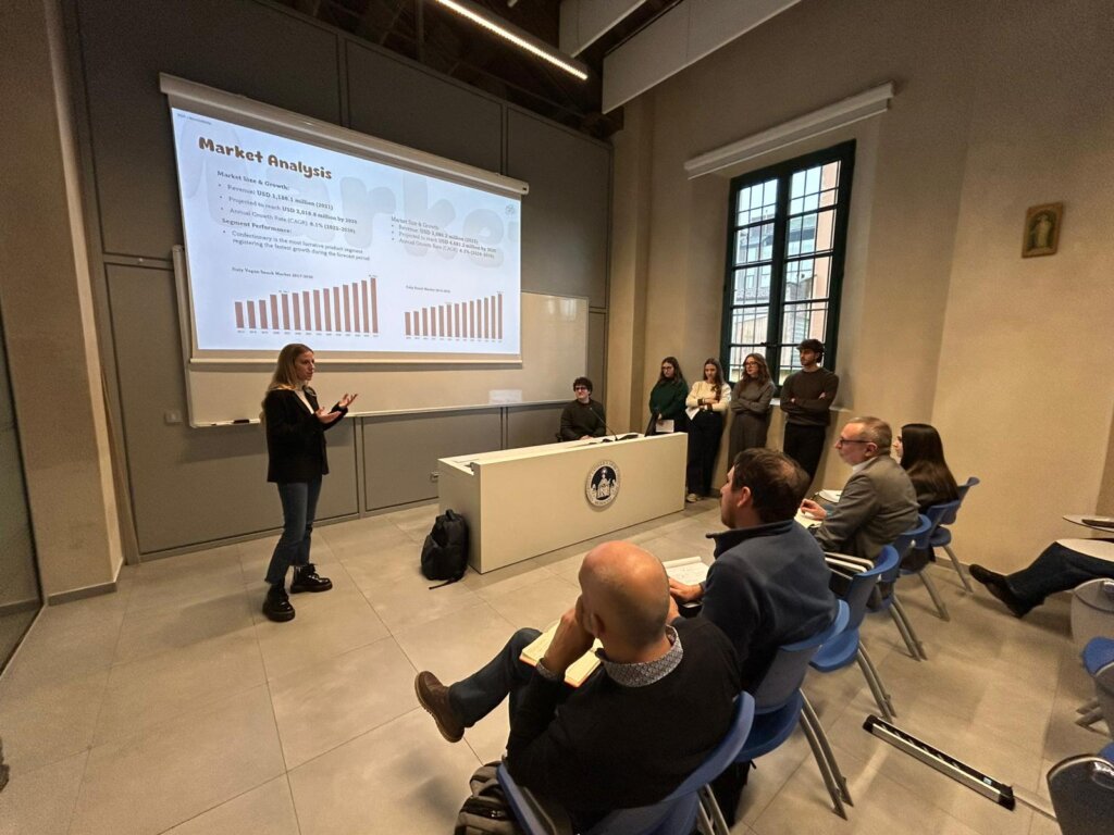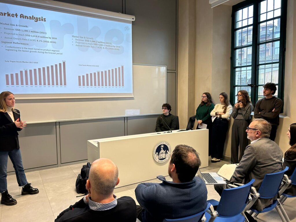 Gli studenti della laurea magistrale in Food processing, della facoltà di Scienze agrarie, alimentari e ambientali si sono, diciamo così, sfidati nella creazione di un prodotto dolciario che guardasse alla sostenibilità. Tre gruppi di studenti per tre prodotti innovativi e mai realizzati. Una challenge per produrre un dolce innovativo, creativo e, soprattutto, buono. L’aveva lanciata Bauli appunto a 16 studenti della laurea magistrale in Food processing: innovation and tradition. Rappresentati, in ogni gruppo, le diverse funzioni aziendali (R&D, Qualità, Produzione, ecc.), gli studenti hanno simulato la presentazione del nuovo prodotto dolciario al “board aziendale”, chiamato a giudicare la validità della proposta. Proprio come accade in azienda. Presente Marco Trezzi, direttore dell’Area ricerca e sviluppo di Bauli e docente in questo corso di laurea della Facoltà di Scienze agrarie, alimentari e ambientali, che ha coinvolto alcuni colleghi dell’antica azienda dolciaria italiana – Enrico Mangano, Miryam Terzano e Jacopo Pighi -, con l’obiettivo di far sperimentare in forma realistica tutte le fasi di nascita di un prodotto.