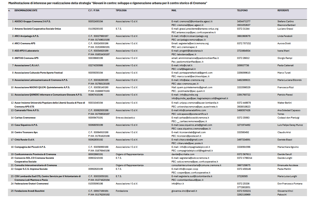 Tra i 36 partecipanti si trovano soggetti noti e meno noti dell’associazionismo cremonese. C’è il centro Criaf diretto da Paola Cattenati, operante nel contrasto al disagio e alla promozione del benessere della famiglia; l’Alac, associazione latino americana, già presente in quel contesto con tante iniziative tra cui proprio il Vecchio Ospedale Festival appena concluso; Città Rurale OdV, attiva con diversi progetti per la tutela dell’ambiente e la cittadinanza attiva, come ad esempio l’esperienza di Urban Bees.