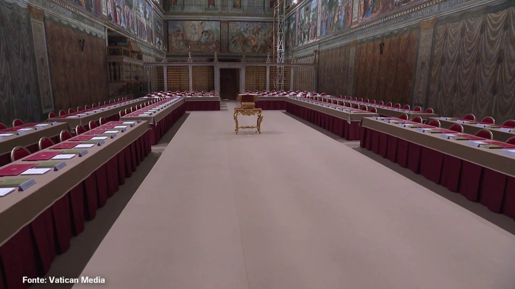 Costituzione Apostolica “Universi Dominici Gregis” di Giovanni Paolo II. La cappella è arredata con sedie di ciliegio, contrassegnate dal nome e cognome di ciascun Cardinale Elettore, e tavoli di legno grezzo, coperti da un panno beige e satin bordeaux, disposti su due file di diverso livello. Davanti all’altare, sotto il Giudizio Universale, un tavolo per l’urna di legno grezzo dove saranno raccolte le schede con i voti, e un leggio con il Vangelo sul quale i porporati presteranno giuramento. I cardinali chiamati ad eleggere il 267° successore di Pietro non cammineranno sul pavimento cosmatesco della Cappella Sistina, ma su una struttura piana in legno coperta da un panno beige, alta