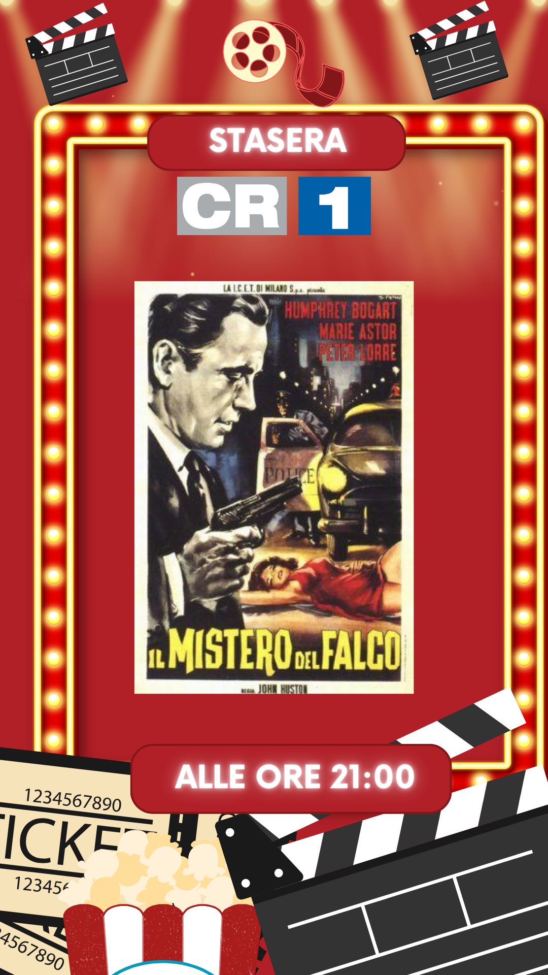 Domenica sera alle 21 su CR1 continua l’appuntamento con il grande cinema. Alle 21 ecco “Il mistero del falco” (The Maltese Falcon), un film del 1941 diretto da John Huston e interpretato da Humphrey Bogart. È tratto da Il falcone maltese, romanzo hardboiled scritto da Dashiell Hammett nel 1929. Il film è stato candidato agli Oscar.