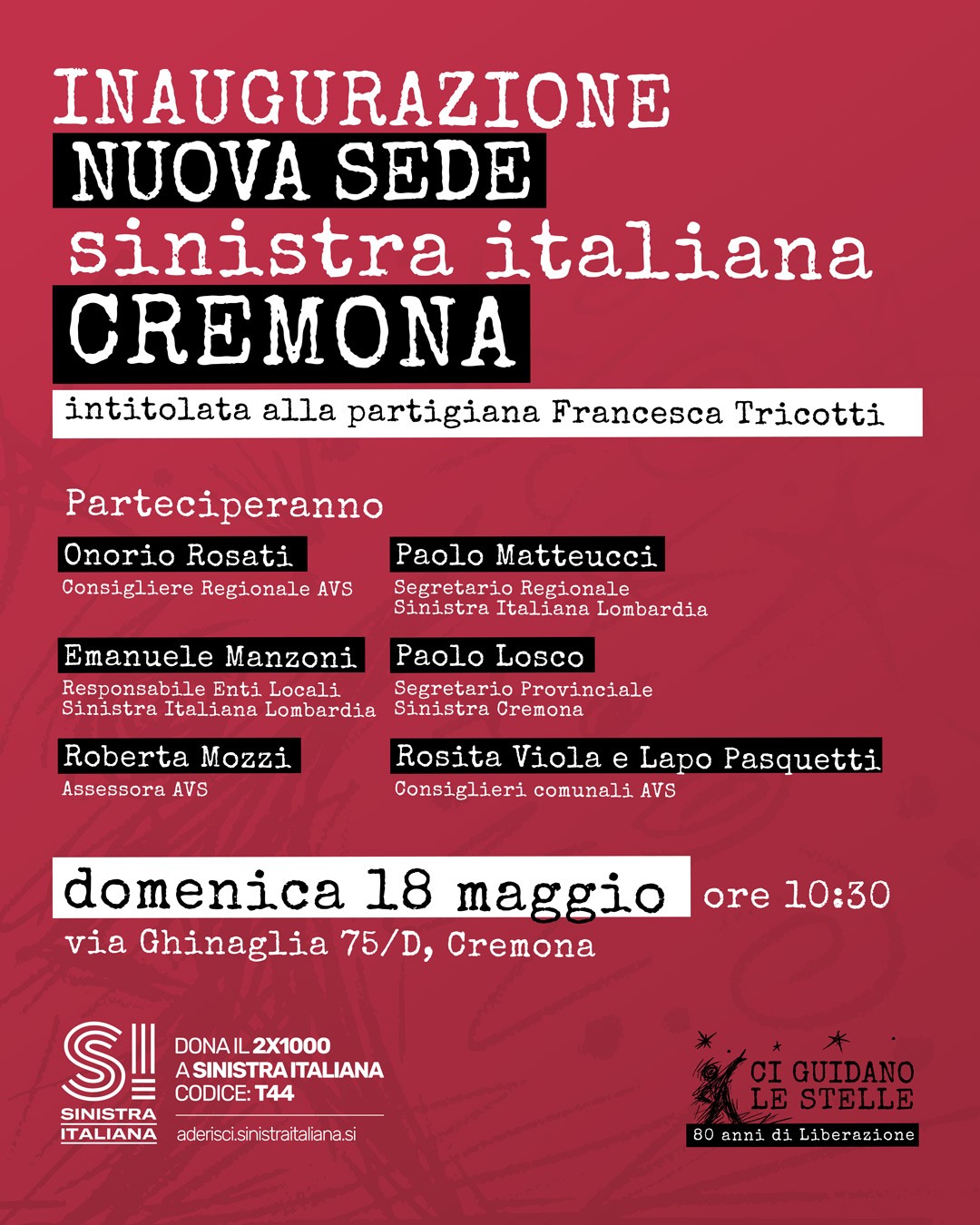 Domenica 18 maggio alle 10.30 Sinistra Italiana Cremona inaugurerà la propria nuova sede in Via Ghinaglia 75/d.