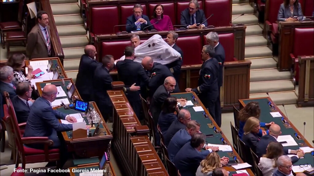 ROMA (ITALPRESS) – Il deputato di +Europa, Riccardo Magi, irrompe nell’Aula della Camera dove si sta svolgendo il premier time vestito da fantasma con un lenzuolo bianco. La protesta è contro l’invito della maggioranza all’astensione ai referendum dell’8 e 9 giugno. Il deputato è stato subito espulso dal presidente della Camera, Lorenzo Fontana, e portato fuori dall’Aula dai commessi.