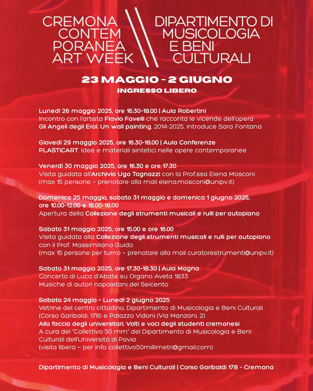 È un ricco e articolato insieme di iniziative quello che il Dipartimento di Musicologia e Beni Culturali dell’Università di Pavia, che ha sede a Cremona, propone in occasione dell’edizione 2025 dell’Art Week cittadina, una manifestazione che attraverso installazioni, mostre, eventi e incontri, trasforma la città per dieci giorni, dal 24 maggio al 2 giugno, in un punto di riferimento per la sperimentazione e la cultura, promuovendo il dialogo tra l’arte contemporanea e il patrimonio storico-artistico cittadino.