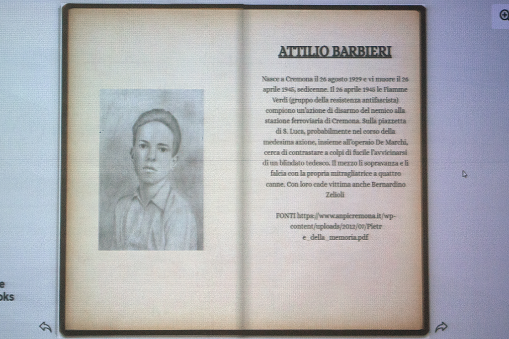 Ne sono nate una galleria di ritratti (in senso grafico, in quanto realizzati a mano dallo studente Andrea Gerevini) e di biografie dei ragazzi che 80 anni fa lottarono per la libertà, raccolti in libro sfogliabile virtualmente; e una mappa interattiva da cui si possono selezionare gli edifici e gli spazi pubblici di Cremona dove si svolsero le vicende cruciali di quel periodo. Il lavoro, illustrato dagli stessi studenti e dalla dirigente Lorenza Badini, si è avvalso della consulenza di Piergiorgio Bergonzi dell’Associazione 25 Aprile.