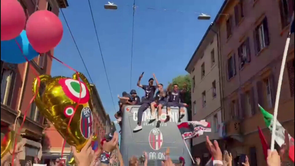 BOLOGNA (ITALPRESS) – A distanza di 12 mesi si replica. Lo scorso anno per la conquista di un posto in Champions, quest’anno per la vittoria della coppa Italia 51 anni dopo l’ultima volta. Ancora una volta tutta la città, con partenza dalla curva Bulgarelli ha salutato la squadra che è salita su un pullman scoperto e ha attraversato il centro cittadino accompagnato dall’affetto di migliaia di persone. Tra i più acclamati il tecnico Vincenzo Italiano, ma anche il presidente Saputo e il ds Sartori.