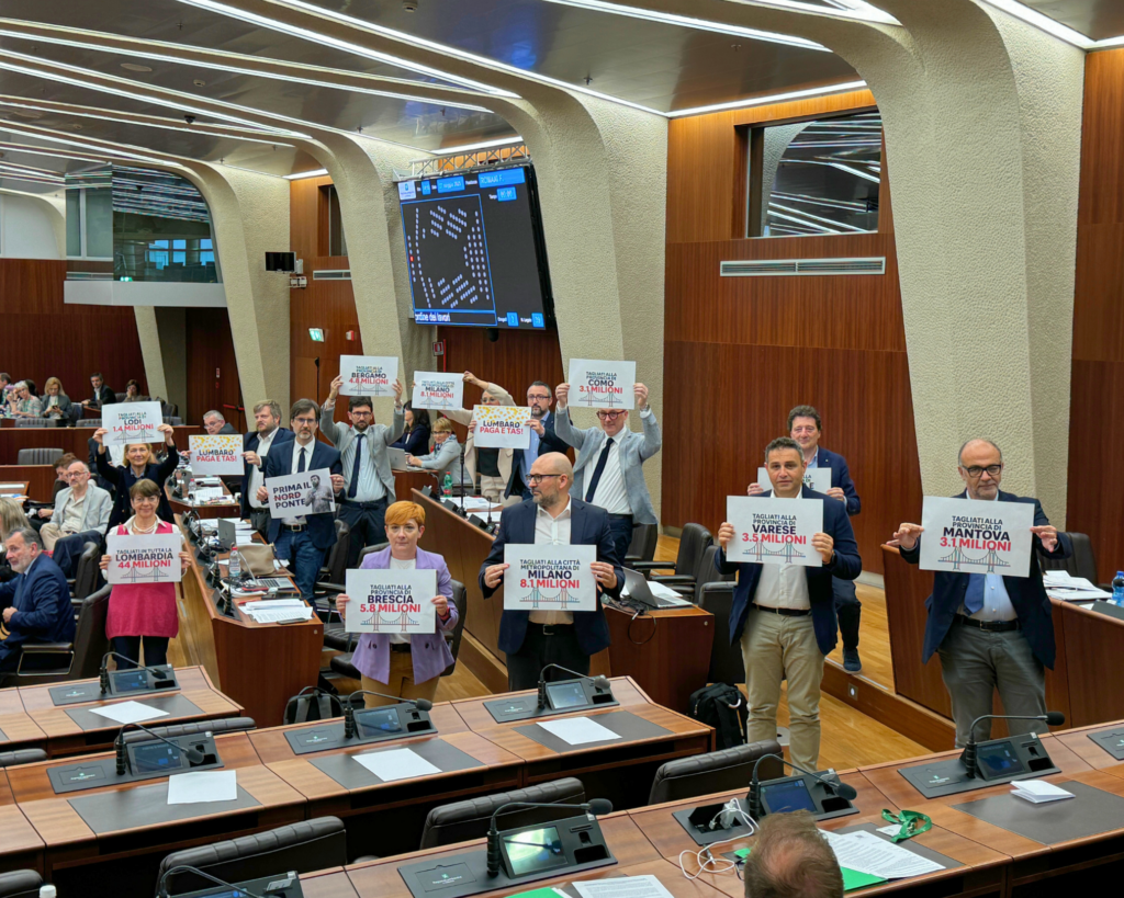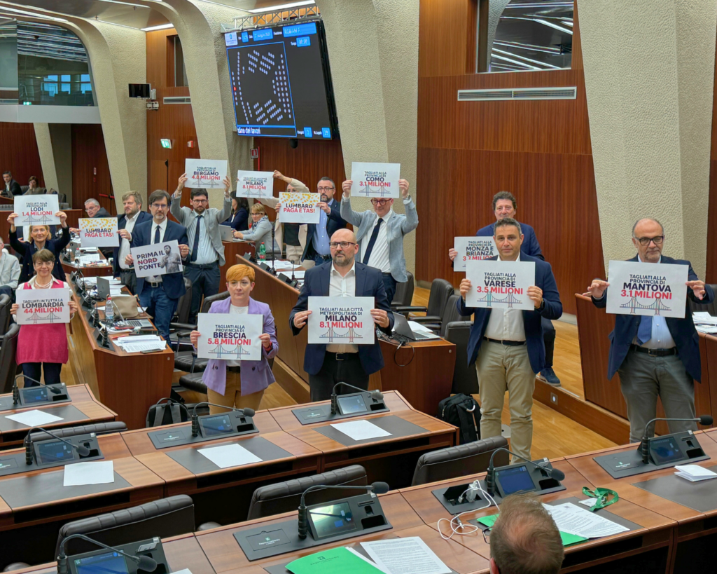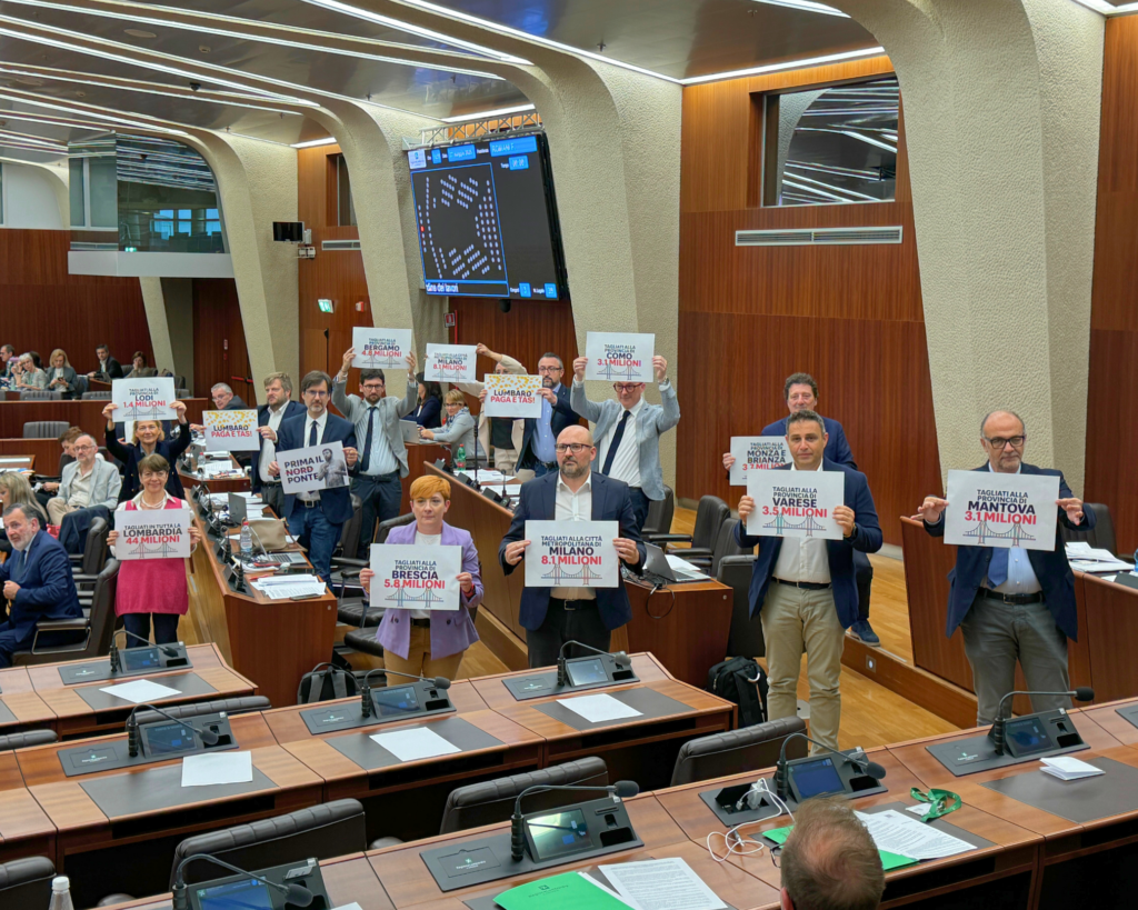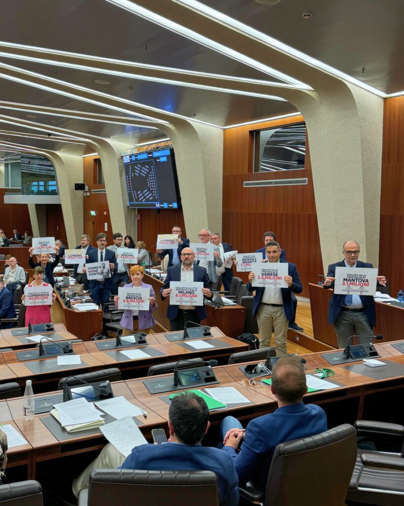 “Evidentemente è questa la vera faccia della Lega – conclude Piloni – che invece di difendere i propri territori, oggi si fa complice di un Governo che toglie risorse ai lombardi per finanziare progetti propagandistici a oltre mille chilometri di distanza”. Per protestare contro la decisione dell’aula i consiglieri dem hanno esposto dei cartelli, ecco le scritte di alcuni: “Lumbard paga e tas”, “Prima il Nord Ponte”, “Tagliati in tutta la Lombardia 44 milioni”.