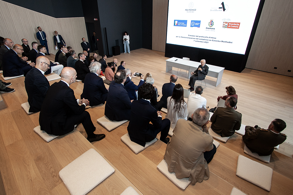 Ad accogliere le autorità nell’aula magna del nuovo Campus il Cavalier Giovanni Arvedi con la Magnifica Rettrice del Politecnico Donatella Sciuto. Tra le autorità presenti: il Prefetto Antonio Giannelli, il Direttore regionale dell’Agenzia del Demanio Massimiliano Iannelli, il Sindaco di Cremona Andrea Virgilio, l’ex Sindaco Gianluca Galimberti, il presidente del Consiglio Comunale Luciano Pizzetti, il Presidente della Provincia Roberto Mariani, il Questore Ottavio Aragona, il Vescovo Antonio Napolioni, i Comandanti provinciali dei Carabinieri Paolo Sambataro e della Guardia di Finanza, Massimo Dell’Anna, il Comandante dei Vigili del Fuoco Michele Castore e per l’Esercito Italiano il Ten. Col. Petrocelli. Per la Fondazione Arvedi Buschini presente anche il dott. Mario Arvedi Caldonazzo.