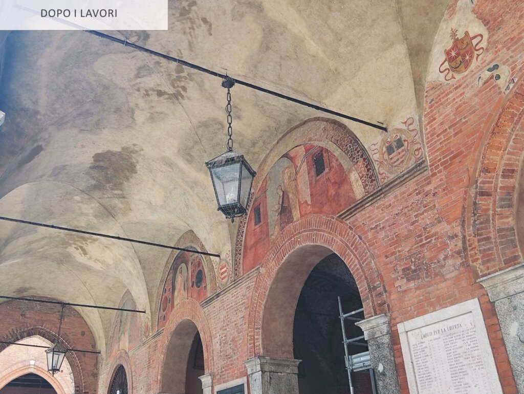 Anche in questo caso è stato necessario un consolidamento dei distacchi degli intonaci dalla muratura, svolto tramite iniezioni di malte apposite, seguito da stuccatura con malte a base di calce naturale e infine dall’equilibratura cromatica mediante acquarelli, che ha restituito unità di lettura a questi pregiati dipinti. Sono così tornati alla luce le raffigurazioni, nelle lunette dei tre archi sotto il portico, verso la piazza, a partire da sinistra, dell’Angelo annunciante, l’Allegoria della Giustizia e l’Annunciazione, caratterizzate da una rara raffinatezza, nonché il Leone di San Marco, a testimonianza dell’occupazione veneziana di Cremona tra il 1499 al 1509, anno in cui il re di Francia Luigi XII liberò la città, come dimostra lo stemma con i tre gigli, emblema araldico della monarchia francese, presente nella Sala degli Alabardieri.