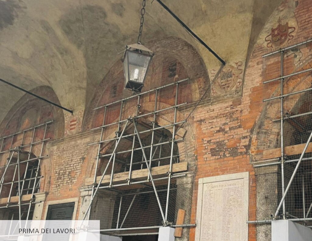 Come illustrato dal dirigente Giovanni Donadio e dall’architetto Massimo Mazzoleni, l’intervento di restauro e consolidamento strutturale delle arcate di Palazzo Comunale, per un importo complessivo di oltre 420mila euro, iniziato nel settembre del 2024, si è reso indispensabile e indifferibile per le gravi condizioni in cui versavano le strutture murarie dell’edificio che presentavano estesi fenomeni fessurativi e deformativi dei grandi archi murari che si aprono sulla piazza.