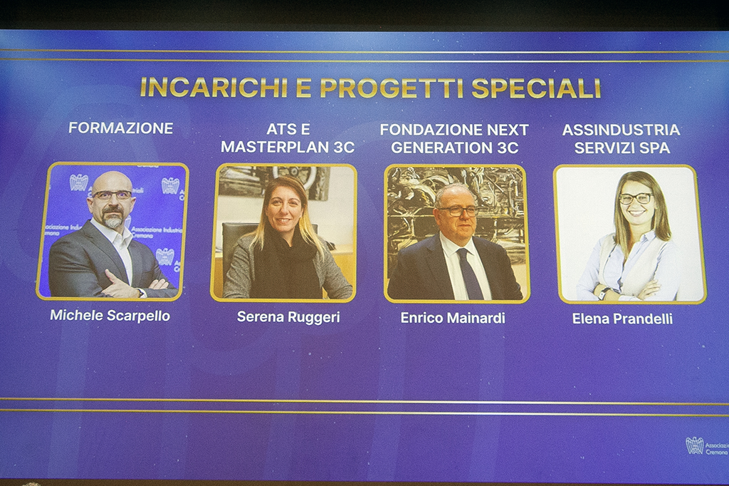 Fanno parte del consiglio di presidenza, inoltre: Elena Prandelli presidente di Assoindustria servizi; Serena Ruggeri, rappresentante nell’Associazione temporanea di scopo – Ats – per il Masterplan 3C; Enrico Mainardi, Fondazione Next Generation 3C; Michele Scarpello con delega alla formazione.
