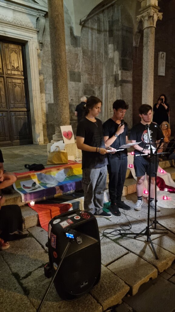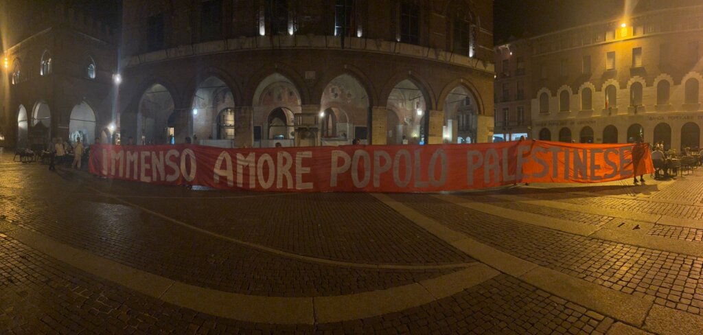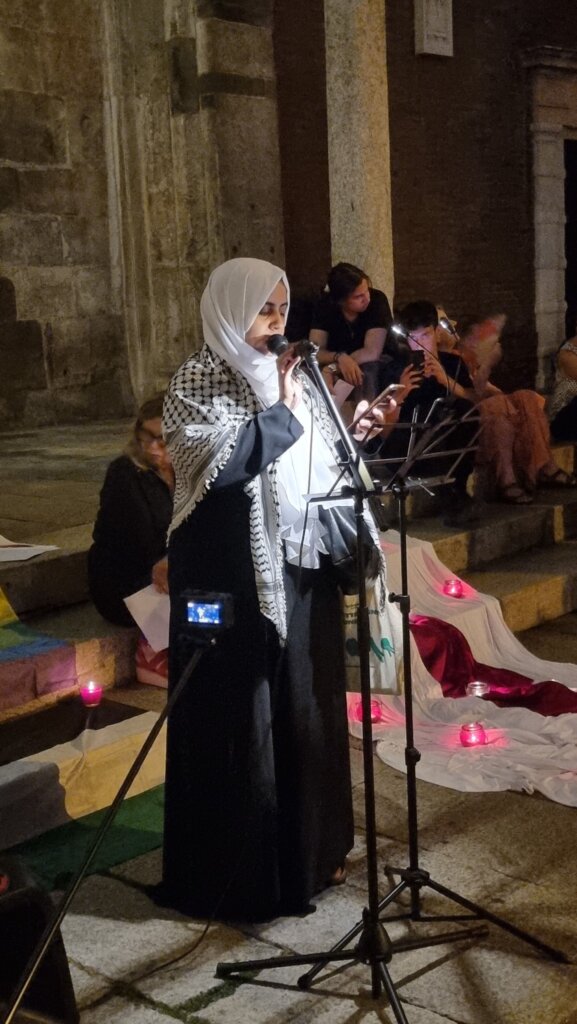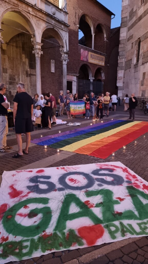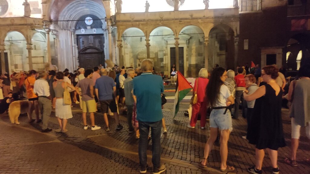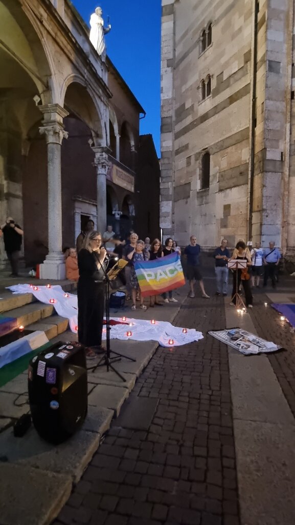 Un’accorata preghiera laica, iniziata alle 21,30 e andata avanti fino a notte, quella che venerdì sera ha visto riuniti italiani e arabi, cristiani e musulmani, tra Cattedrale e Battistero di Cremona per chiedere lo stop al genocidio a Gaza. Una manifestazione senza simboli di partiti o movimenti, solo le bandiere arcobaleno e della Palestina, distese a terra come un tappeto e illuminate dai lumini.