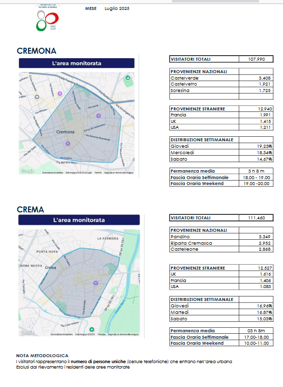I dati confermano che i centri di entrambe le città non sono solo luoghi di passaggio, ma vere destinazioni urbane, capaci di trattenere i visitatori per un tempo significativo: la permanenza media si attesta a 3 ore e 8 minuti sia a Cremona che a Crema.