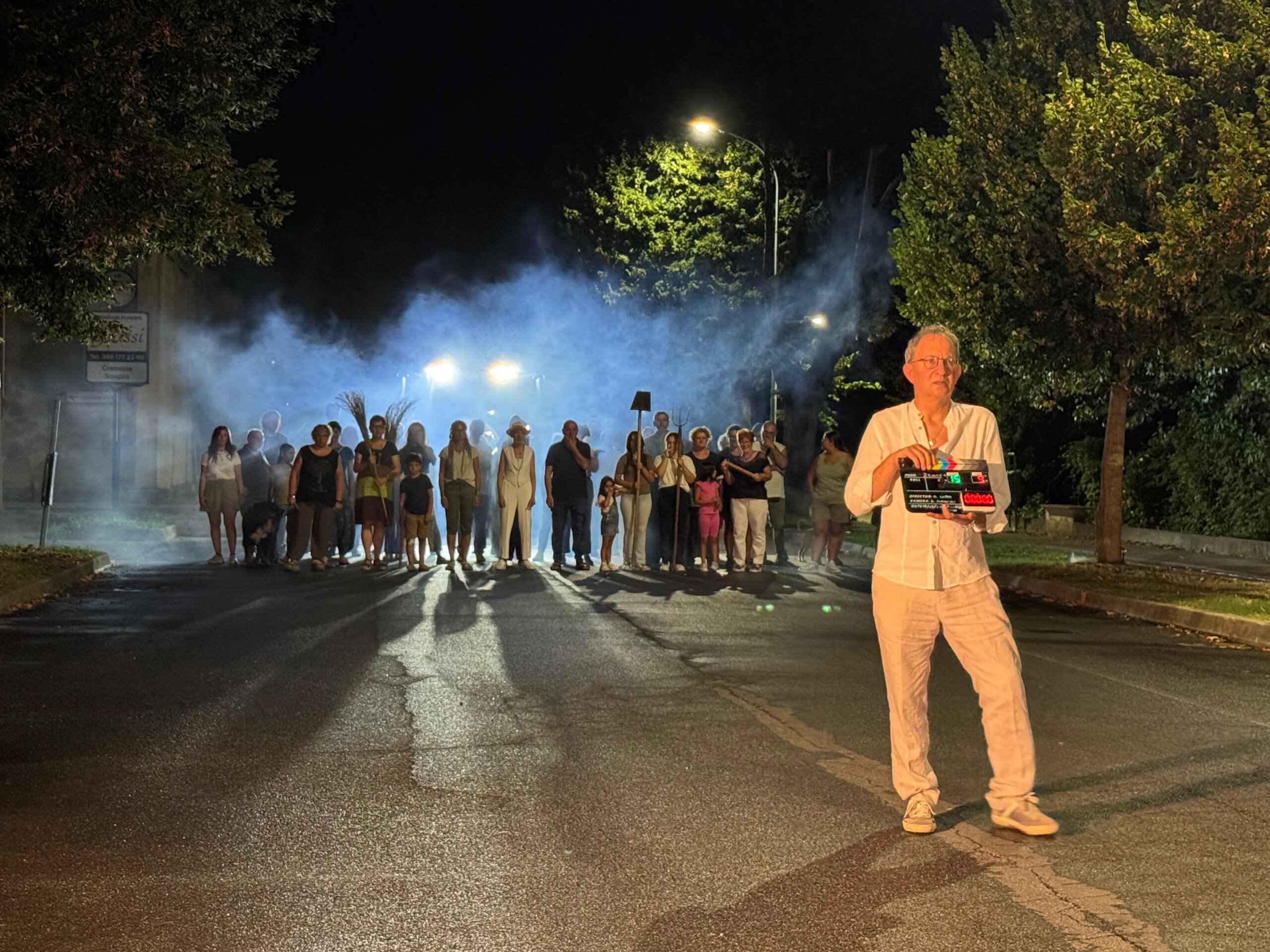 “È una scena delicatissima perché ci sono tantissimi personaggi: stasera abbiamo tutte le comparse – spiega il regista Antonio Capra – .È la sequenza in cui la massa avanza verso Zenobia: il popolo finalmente si rivolge a lei. La cosa bella è che partecipano tutti anche dal punto di vista tecnico: sono venuti con i trattori e faranno le luci con i trattori; c’è chi bagna la strada, chi fa l’aiuto tecnico, chi la comparsa. È una partecipazione attiva degli abitanti di Stagno Lombardo che dà un grande valore aggiunto”.