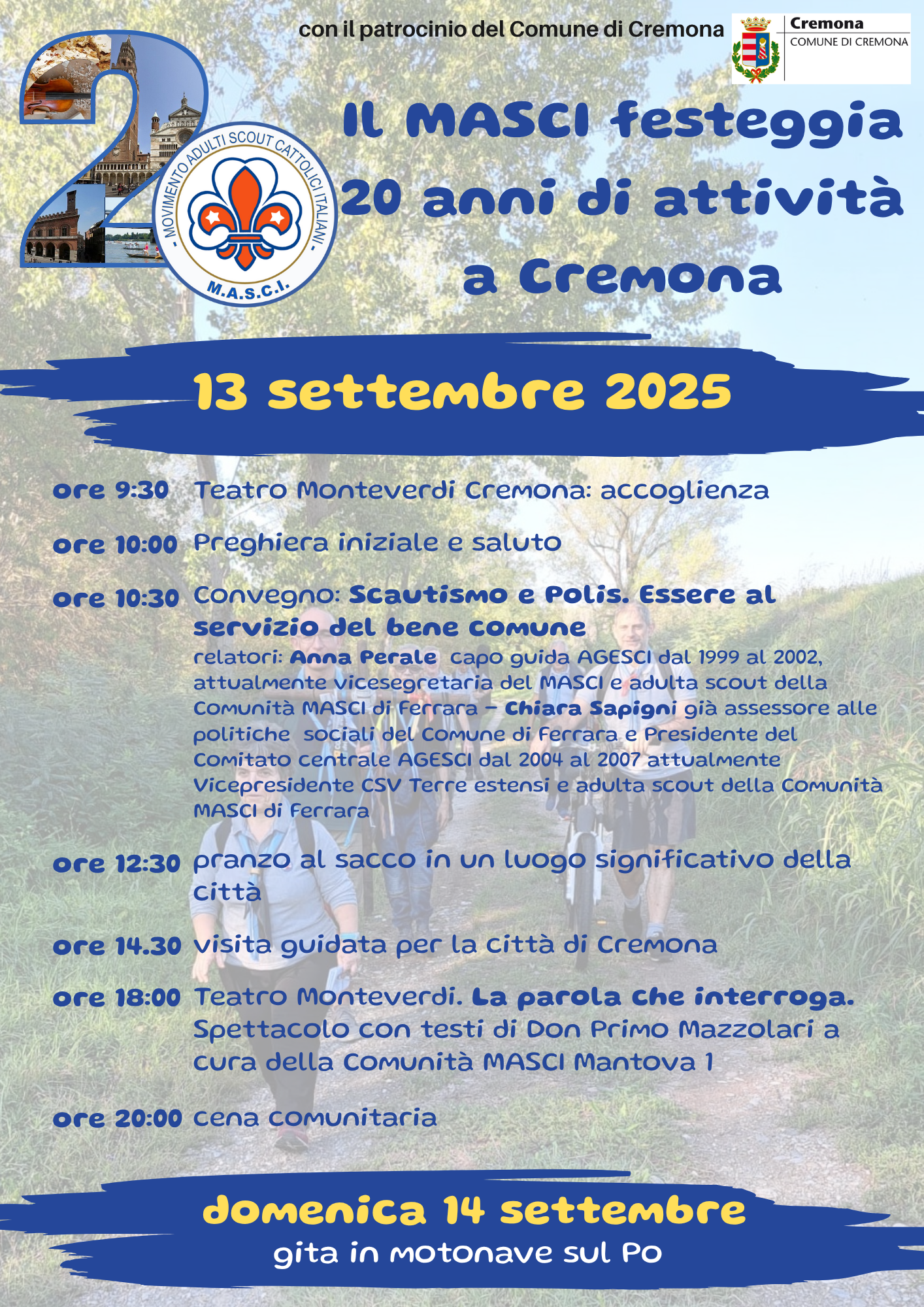 Festeggia vent’anni di presenza a Cremona il Movimento Adulti Scout Cattolici Italiani, che con il patrocinio del Comune ha organizzato una serie di attività che si svolgeranno nella giornata di sabato 13 settembre.
