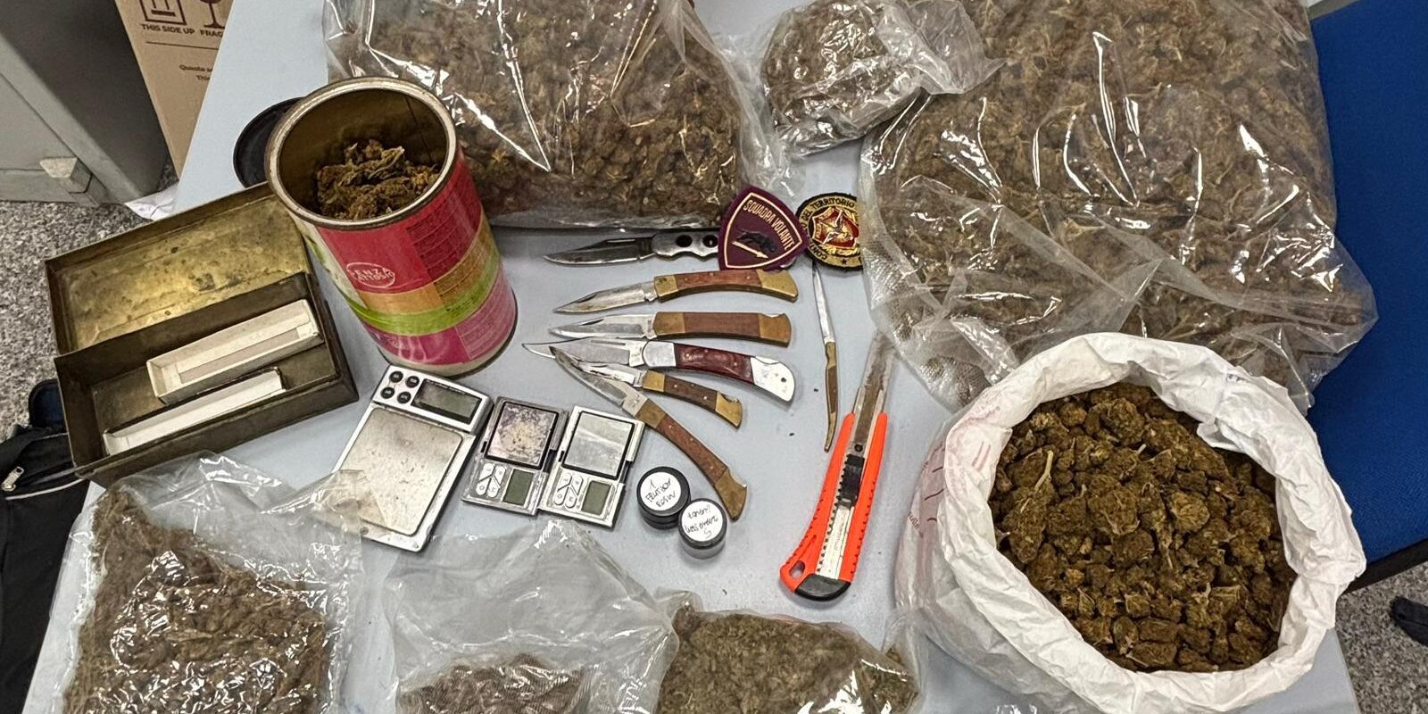 Nella camera da letto del ragazzo i poliziotti hanno rinvenuto sulla scrivania 0,47 grammi di hashish avvolti in una carta da forno bianca e un pugnale di 25 centimetri di lunghezza con la lama sporca di stupefacente. Sul comodino, una pistola ad aria compressa. Nella camera da letto del padre, invece, gli agenti hanno trovato in una cassettiera un sacchetto con la marijuana. Nella lavanderia al piano terra, in una valigia rossa, sopra la lavatrice, c’erano due buste con dell’altra marijuana. E ancora lo stesso stupefacente è stato trovato in una borsa blu: droga nelle buste e in un barattolo. In un contenitore di latta c’erano sette coltelli a serramanico, tutti con le lame sporche di hashish. Tre bilancini di precisione sono invece stati trovati in soggiorno, nel cassetto della credenza.