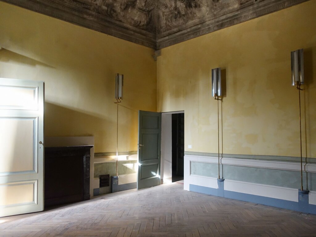 SALA MANFREDINI. Firmato e datato 1785 da Giovanni Manfredini, il sofisticato ciclo decorativo della grande sala che si affaccia su via XX Settembre è stato concepito dall’artista in collaborazione con l’abate Isidoro Bianchi. Manfredini compone la stanza in ogni dettaglio, compreso il disegno delle porte. Al centro delle pareti principali due dipinti di grande formato rappresentano vedute di rovine in stile neoclassico, in evidente contrasto con i solidi elementi architettonici che le incorniciano. La complessa teoria di simboli inseriti tra gli elementi architettonici è di chiaro impianto massonico, anche se non ripete la struttura del tempio di Salomone, nella caratteristica configurazione della Loggia.