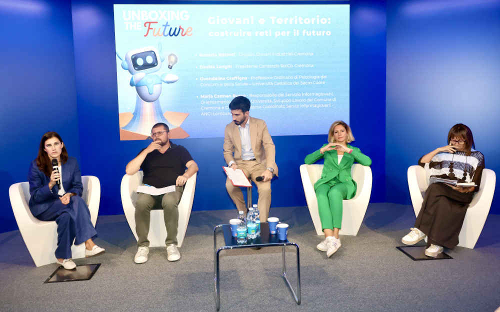 La prima tavola rotonda, dal titolo Giovani e Territorio: costruire reti per il futuro, ha visto un confronto tra istituzioni, imprese e realtà sociali per affrontare insieme le sfide delle giovani generazioni al quale hanno preso parte Roberta Bittanti (Gruppo Giovani Industriali Cremona), Davide Longhi (Presidente del Consorzio Sol.Co. Cremona), Guendalina Graffigna (Professore Ordinario di Psicologia dei Consumi e della Salute – Università Cattolica del Sacro Cuore) e Maria Carmen Russo (Responsabile del Servizio Informagiovani del Comune di Cremona e Direttore del Sistema Coordinato Servizi Informagiovani – Anci Lombardia).
