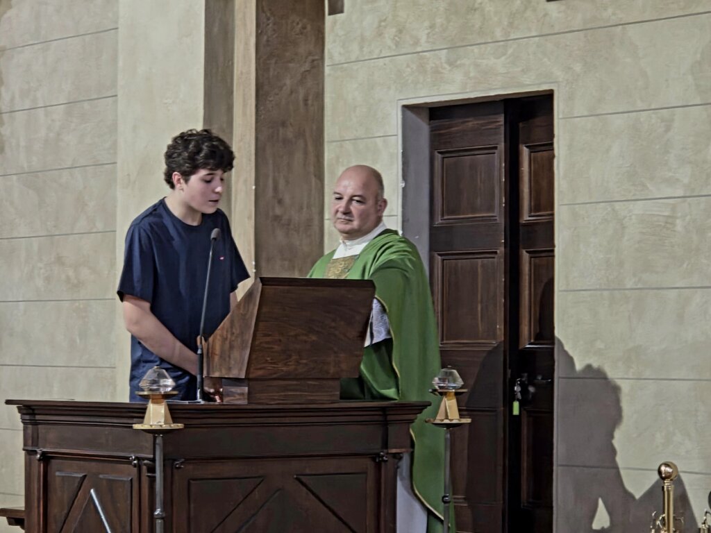 Per leggere la preghiera dei fedeli, don Martinelli ha invitato informalmente dal pulpito lo studente di quinta A Grafica e comunicazione Ruben Maffini, encomiabile per aver sempre partecipato e dato il proprio contributo all’evento.