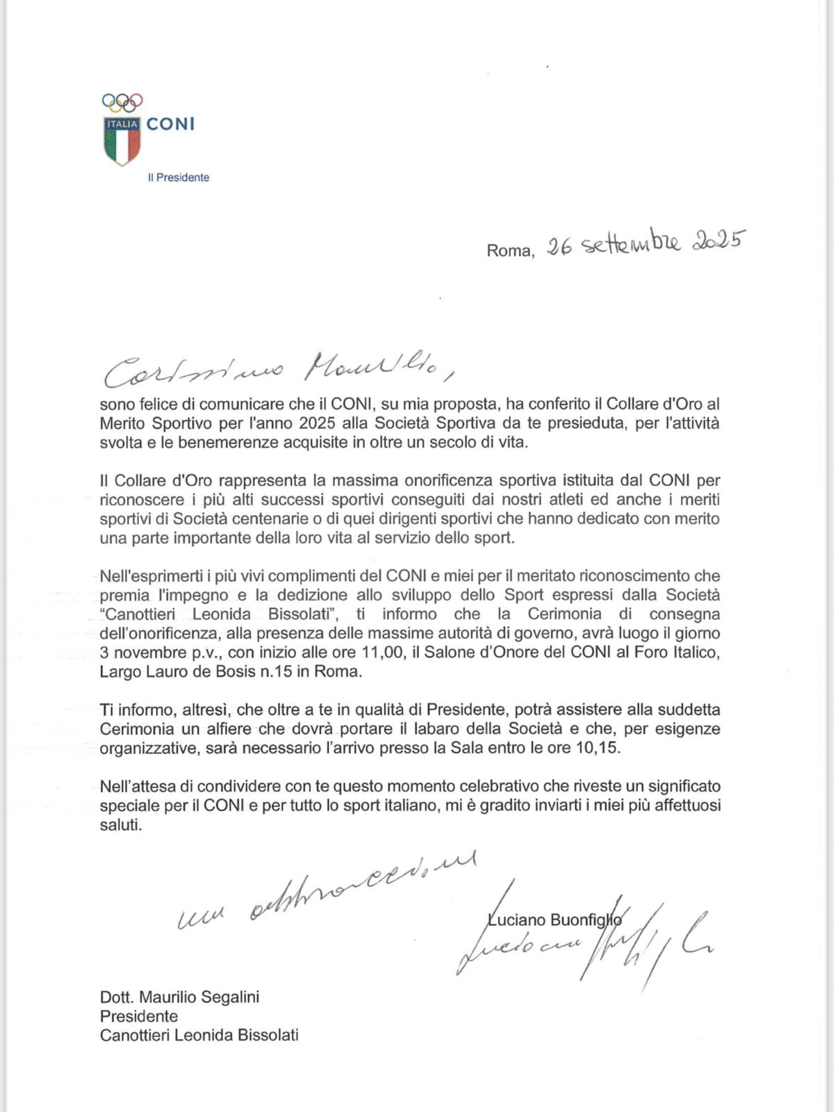 Il Coni ha assegnato alla Canottieri Leonida Bissolati il Collare d’Oro al Merito Sportivo 2025, la massima onorificenza dello sport italiano per società e dirigenti che hanno lasciato segno nel tempo. La comunicazione ufficiale, data Roma 26 settembre, porta la firma del presidente Luciano Buonfiglio.