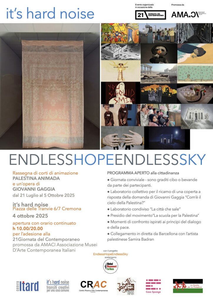 Il progetto EndlessHopeEndlessSky, inaugurato a Luglio presso lo spazio culturale di It’s hard noise di Cremona, in Piazza delle Tranvie 6/7, sarà visitabile fino al 5 Ottobre, quindi la rassegna Palestina Animada, che si arricchirà di nuovi video, rimarrà a disposizione per le scuole e di chi ne farà richiesta.