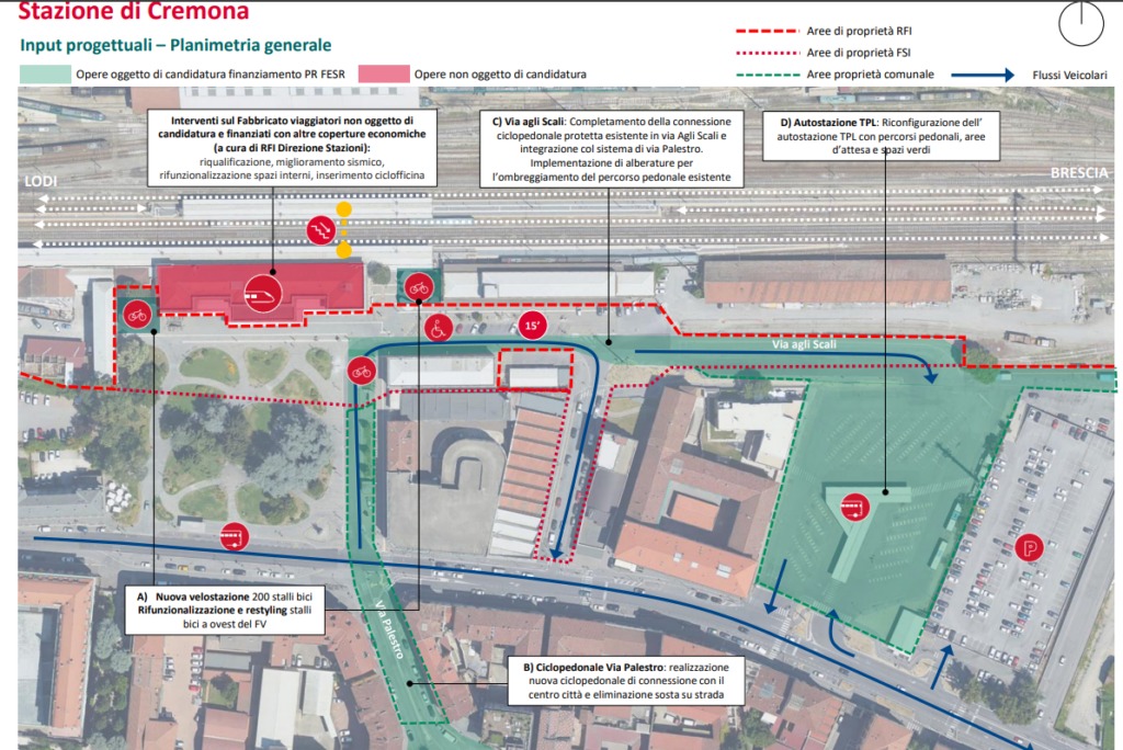 Con la delibera di Giunta che prende atto della cessione da parte di RFI al Comune di Cremona di alcune aree attorno alla stazione ferroviaria – in comodato gratuito – può prendere concretamente il via il restyling in chiave intermodale di questa importante porzione cittadina con l’obiettivo di incentivare i trasferimenti in bicicletta da per la stazione e migliorare la fruibilità del terminal degli autobus.