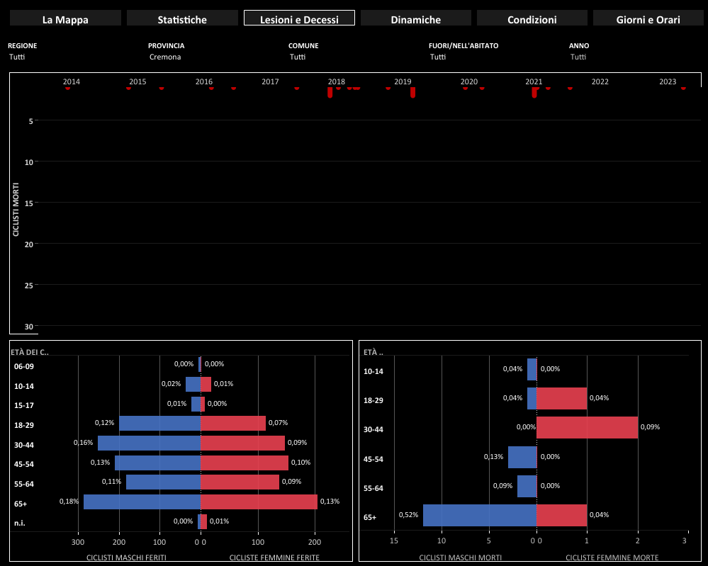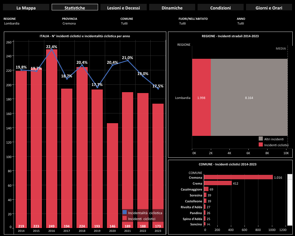 Complessivamente, nei dieci anni presi in esame dallo studio del Politecnico, nel Cremonese si sono registrati 1.998 incidenti in bici, quasi un quarto degli incidenti complessivi registrati sul territorio (8.164).