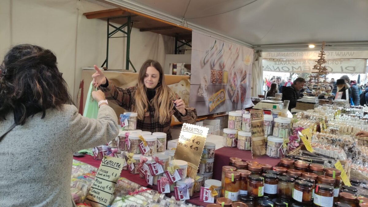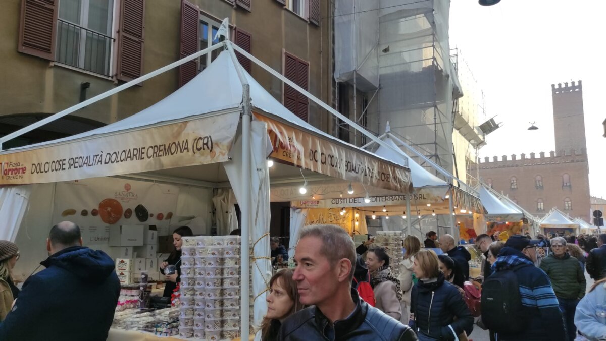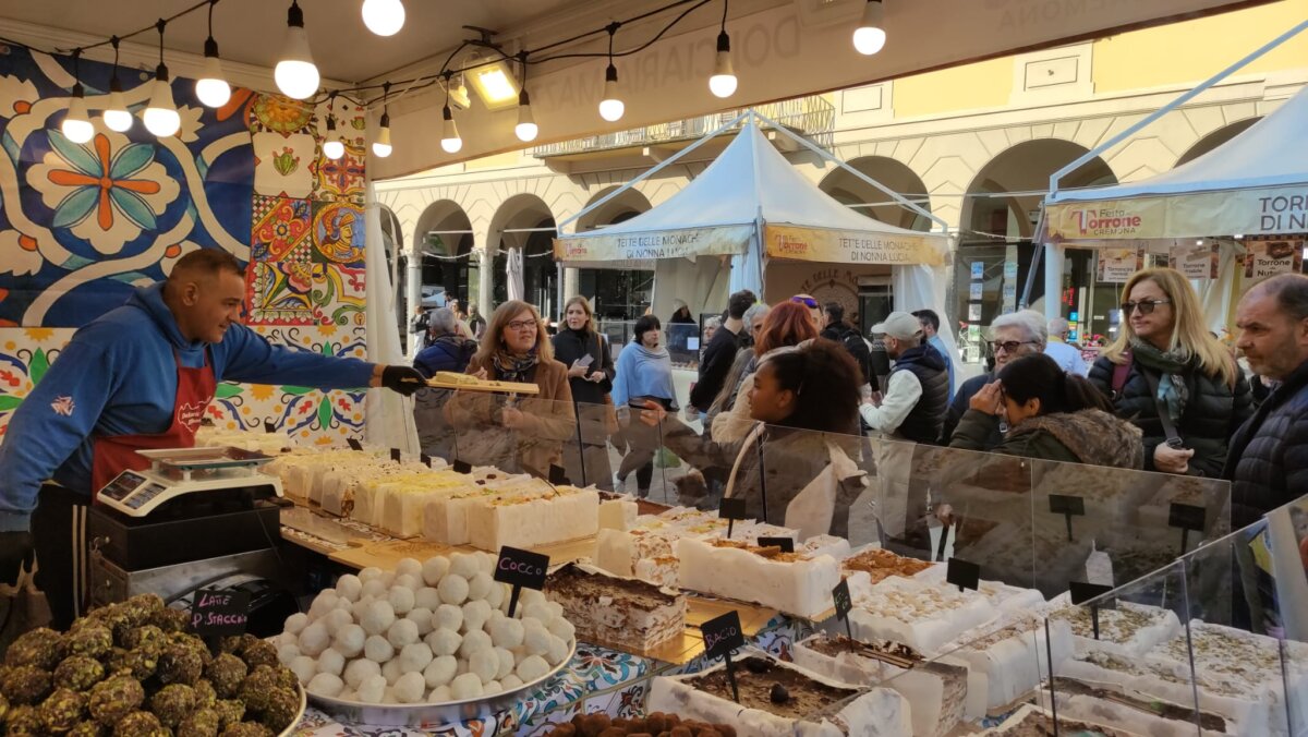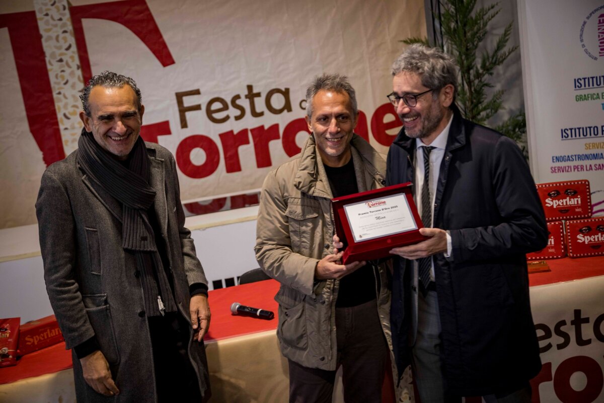 “Torrone d’Oro” virtualmente consegnato a Mina dal sindaco Andrea Virgilio, nelle mani di Riccardo Viani, amministratore delegato di Sperlari questa mattina, in uno dei momenti clou della festa del Torrone, all’interno del palatenda in piazza Roma.
