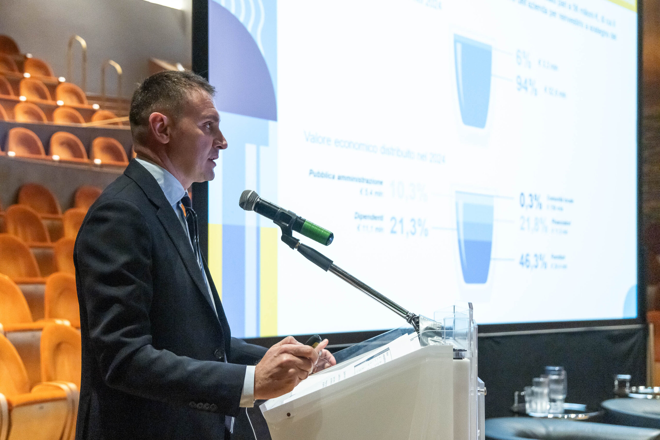 Dopo i saluti istituzionali del Sindaco Andrea Virgilio, del Presidente dell’Ufficio d’Ambito della Provincia di Cremona Stefano Belli Franzini e del Presidente di Padania Acque Cristian Chizzoli, sono entrati nel dettaglio del Bilancio il direttore generale Stefano Ottolini e di Samir Traini, partner di REF Ricerche.