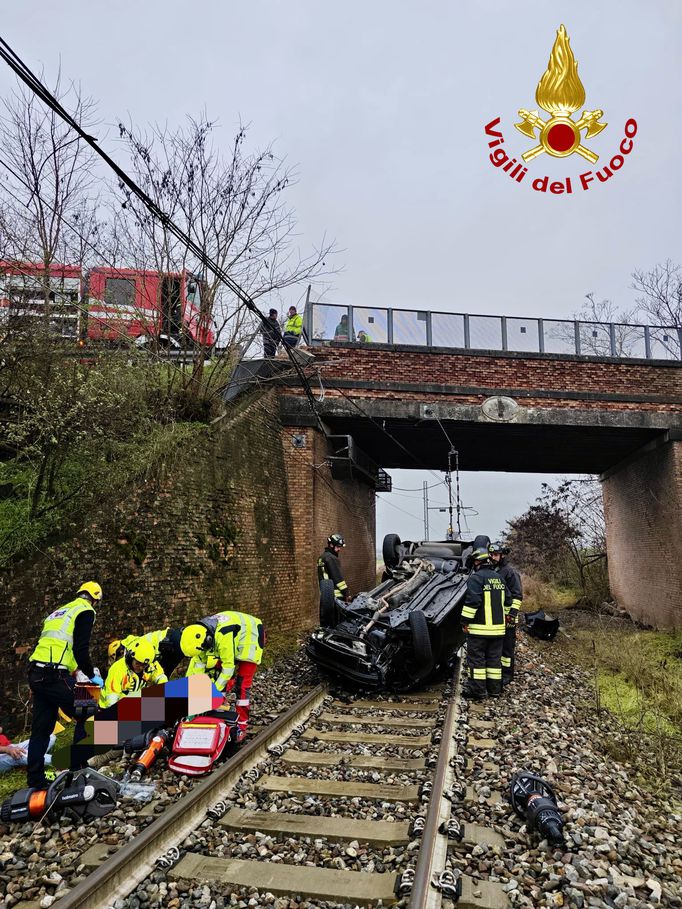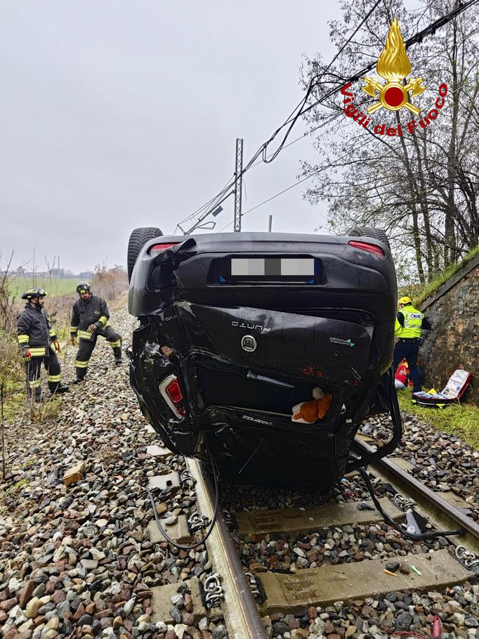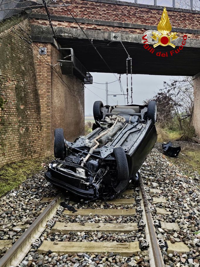L’auto è precipitata sui binari, finendo capovolta e solo per un colpo di fortuna non ha centrato un treno che sarebbe passato di lì a poco ed è riuscito ad arrestarsi a poca distanza.