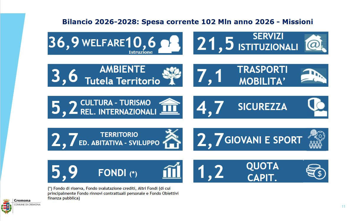 Tra le voci in uscita si segnalano i contributi alla finanza pubblica: per il 2026 il Comune deve restituire allo Stato 361.694 euro per effetto della legge di Bilancio 2024 e accantonarne 427.738 per quella del 2025.