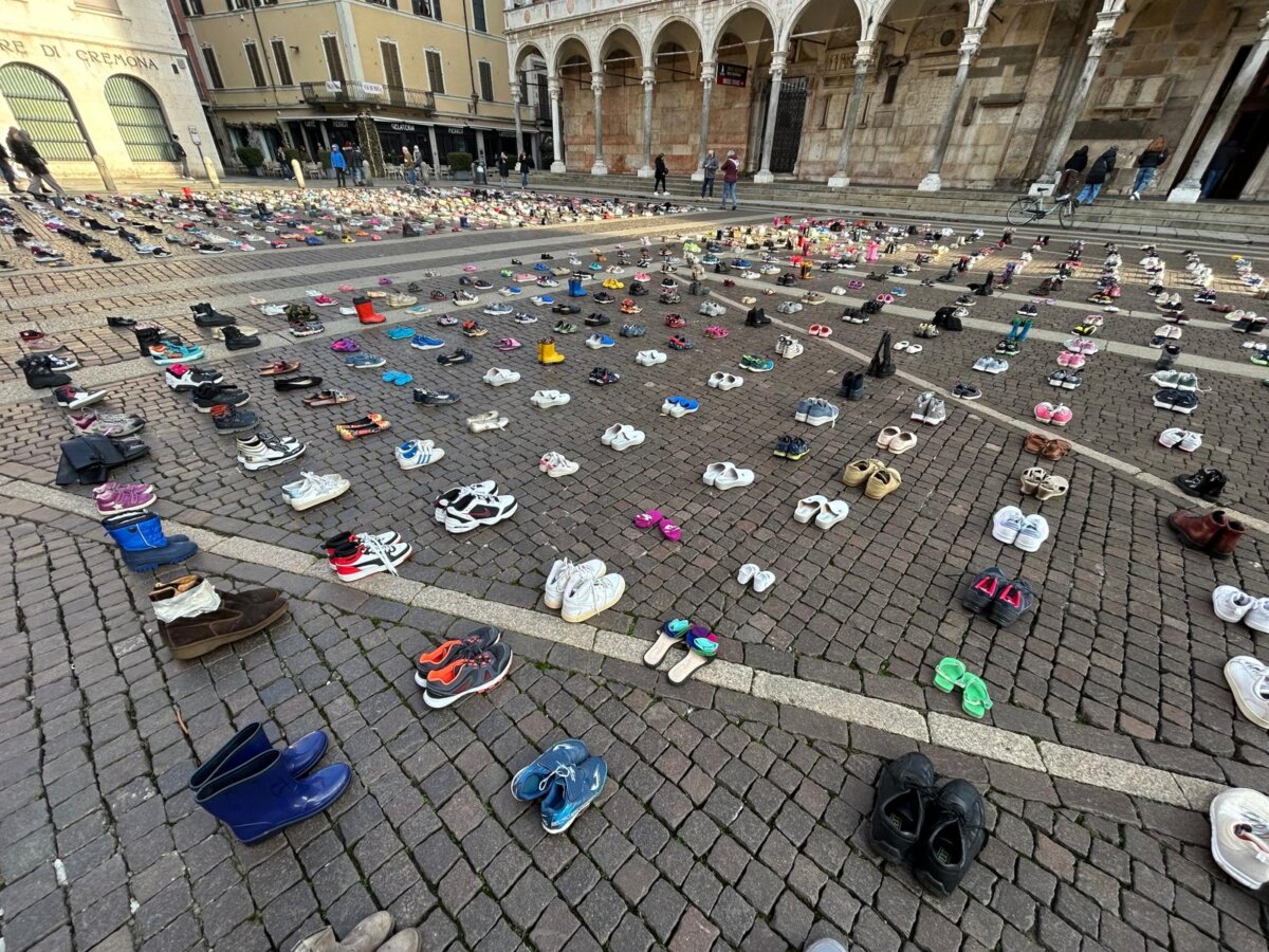 Una distesa di scarpe ha invaso piazza del Comune a Cremona: una maxi installazione organizzata dal gruppo di docenti “La scuola per la Palestina” per commemorare i 20mila bambini uccisi a Gaza. Sono oltre 5000 scarpe esposte, che poi andranno in beneficenza al carcere e alle associazioni che ne faranno richiesta.