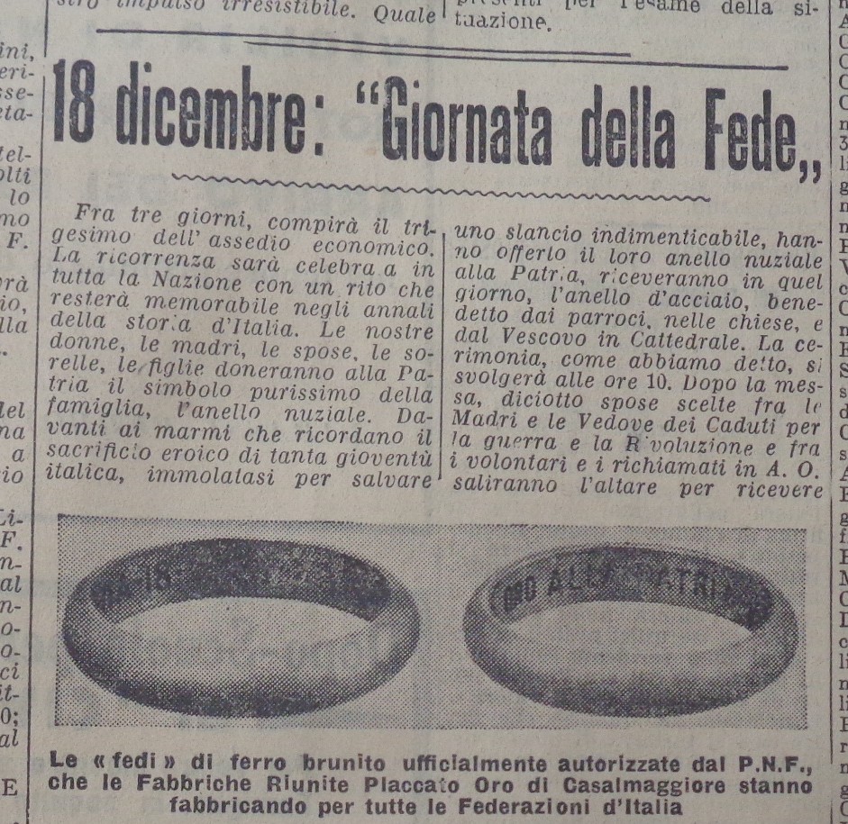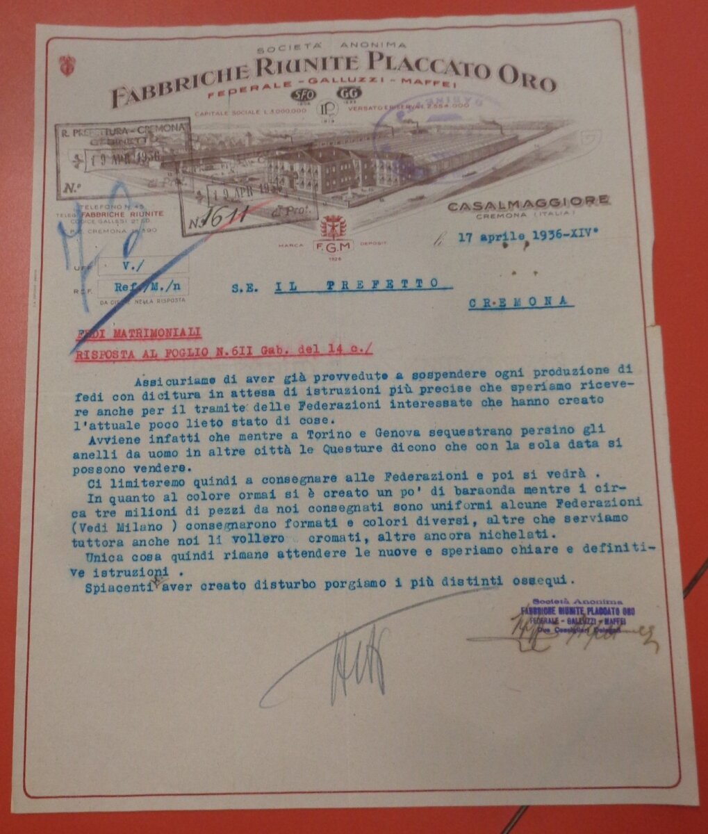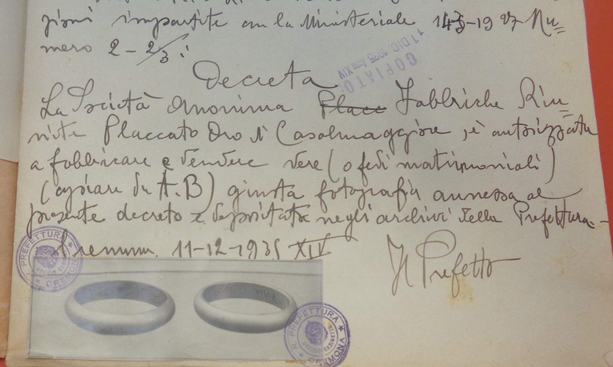 La necessità di disporre di una quantità importante di anelli nuziali in metallo da sostituire con quelli in oro, donati dagli sposi italiani, indusse la fabbrica, con sede in Casalmaggiore, a proporre al prefetto di Cremona di accreditarsi come una fornitrice delle fedi occorrenti. L’autorità prefettizia il 12 dicembre concedeva il via libera alla produzione ed alla commercializzazione su tutto il territorio nazionale del materiale confezionato dalle Fabbriche Riunite.