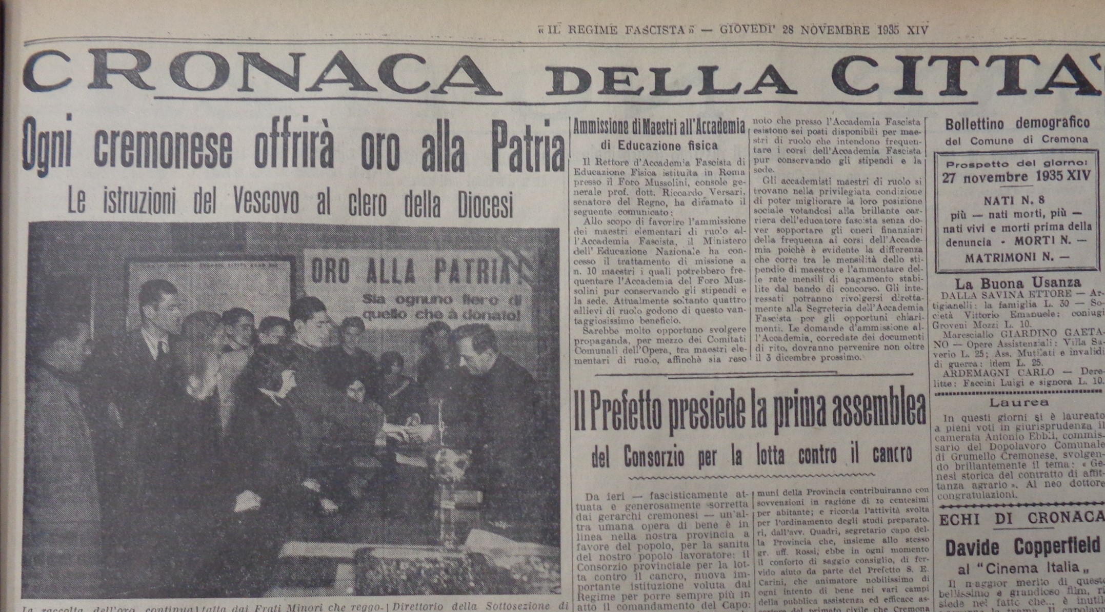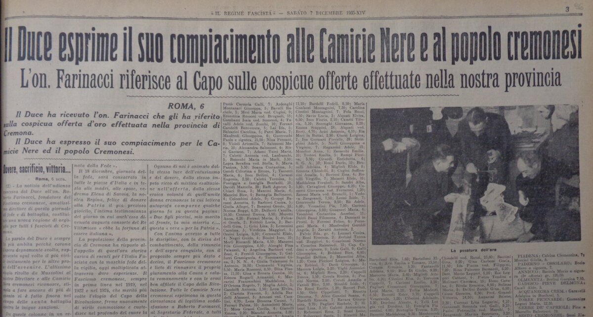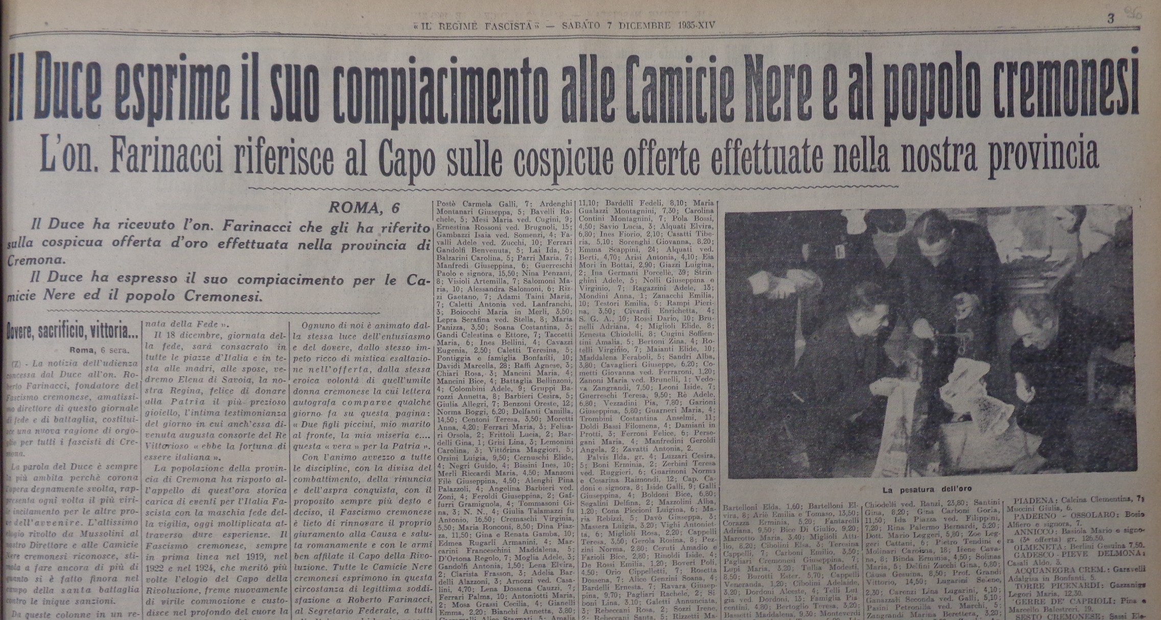 Dopo alcuni rinvii per motivi organizzativi la Federazione fascista di Cremona definiva di programmare per il lunedì 2 dicembre la “giornata cremonese dell’oro”; una sortita che Farinacci promosse, anticipando la data da fissarsi a livello nazionale, per distinguersi e proporsi come alfiere del patriottismo nazionale. L’iniziativa prevista in ogni comunità della provincia si avvaleva del supporto tanto degli insegnanti elementari, invitati a trasmettere agli alunni l’invito per i genitori ad offrire l’oro, quanto del clero in ogni sua ramificazione territoriale.