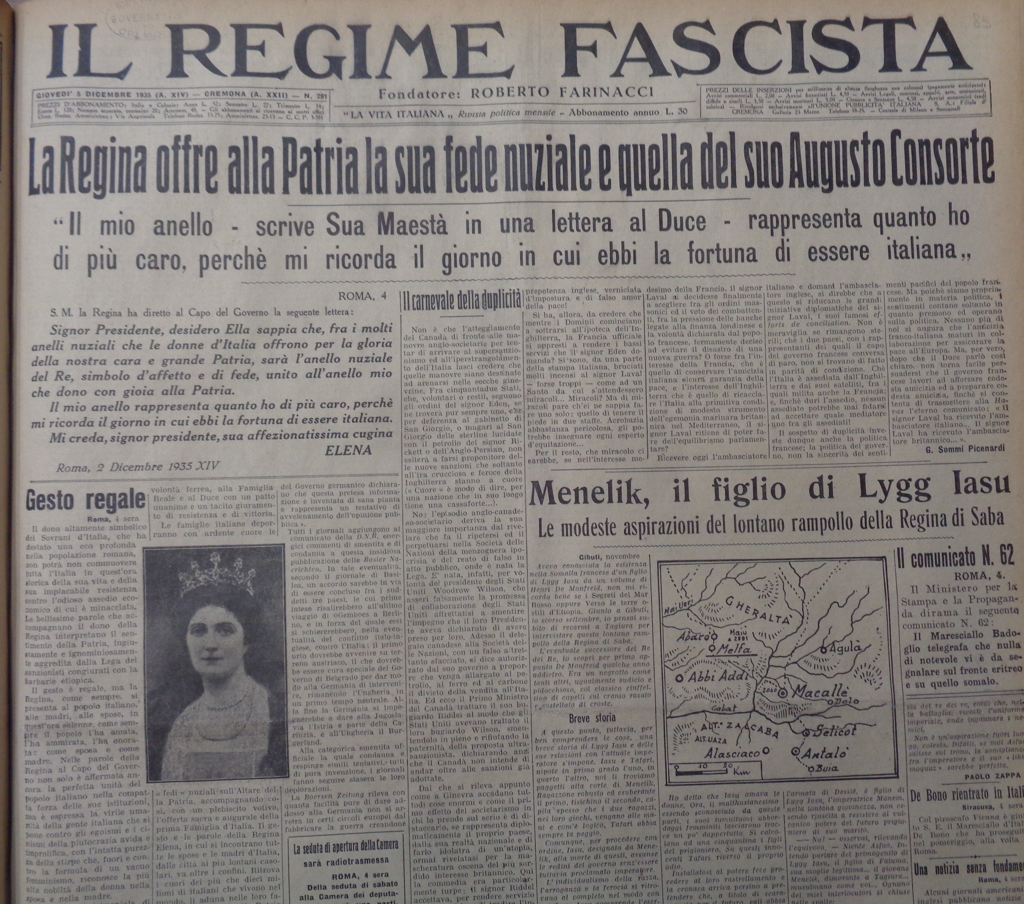 “Se avanzo seguitemi, se indietreggio uccidetemi, se mi uccidono vendicatemi”; questo motto, coniato da Benito Mussolini, campeggiava, a piena pagina, sul Regime Fascista del 3 ottobre 1935. Il foglio del fascismo cremonese celebrava pertanto l’avvio della spedizione militare italiana volta alla conquista dell’Etiopia; si trattava dell’agognato “posto al sole” che l’Italia, da tempo, reclamava al pari cospetto delle principali potenze dell’epoca.