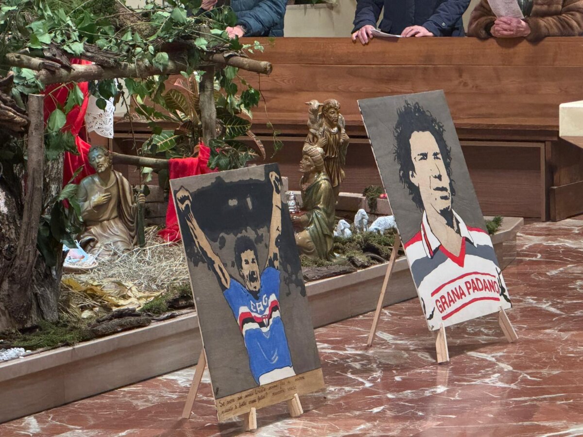 Sull’altare due piccoli quadri spontanei dedicati a Gianluca. Che sembrano essere un prolungamento di quel murales che campeggia sul campo da calcio dell’oratorio accanto alla chiesa presso cui Vialli ha mosso i primi passi nel mondo del calcio.