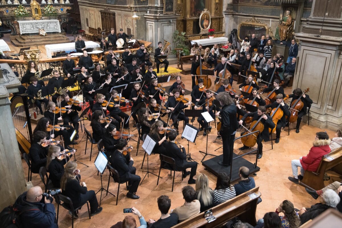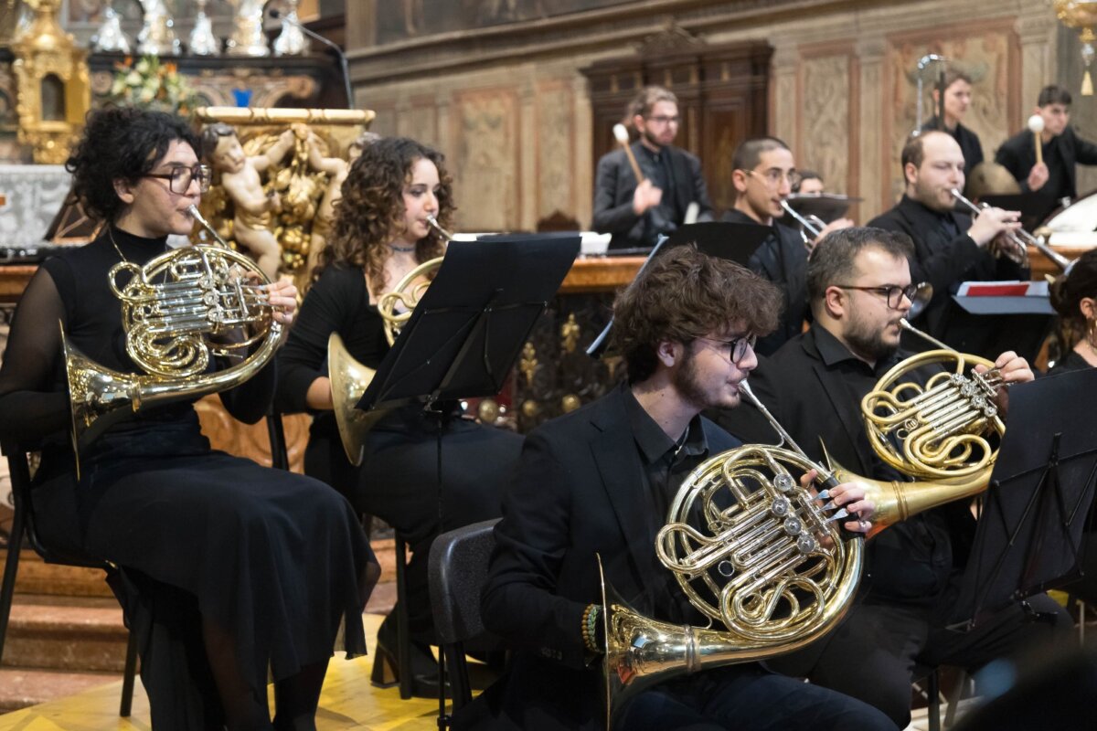 L’ensemble, composta da oltre sessanta giovani musicisti provenienti da diversi paesi europei e da altri paesi del mondo, è stata affidata alla direzione musicale di Marco Pierobon, che ha affrontato il triplo ruolo di direttore, arrangiatore e solista, alternando bacchetta e tromba tra meravigliose pagine sinfoniche di Beethoven, Musorgskij, Smetana e Morricone, che hanno suscitato l’entusiasmo dei presenti.