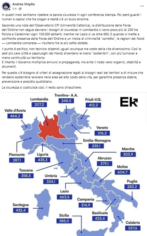 Il sindaco Andrea Virgilio torna a parlare di sicurezza e organico di forze dell’ordine su Facebook. Scrive il primo cittadino: “In questi mesi sentiamo ripetere la parola sicurezza in ogni conferenza stampa. Poi però guardi i numeri e capisci che tra slogan e realtà c’è un buco enorme. “Secondo una nota dell’Osservatorio CPI (Università Cattolica), la distribuzione delle Forze dell’Ordine non segue davvero i bisogni di sicurezza: in Lombardia ci sono poco più di 200 tra Polizia e Carabinieri ogni 100.000 abitanti, mentre nel Lazio si va oltre 660. E quando si mette a confronto presenza delle Forze dell’Ordine e un indice di criminalità “corretto”, le regioni del Nord — Lombardia compresa — risultano tra le più sotto-dotate”.
