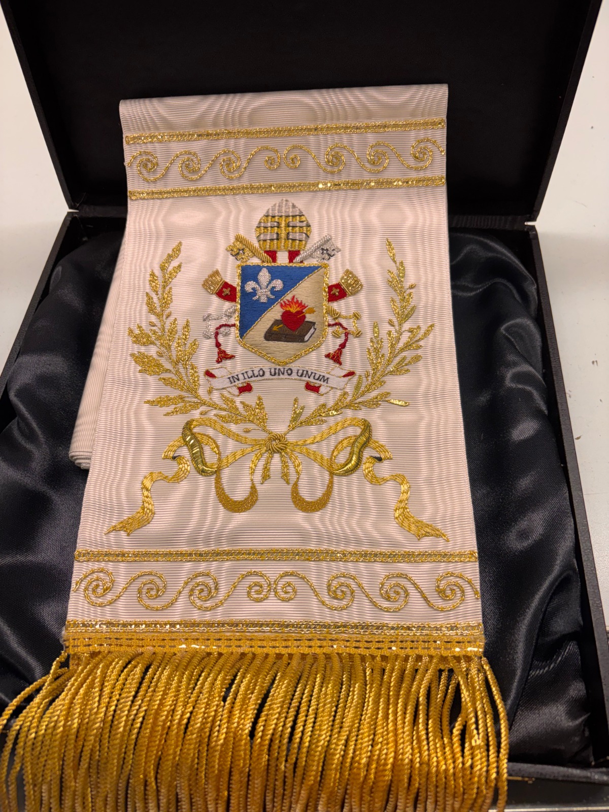 L’idea della fascia è stata di Don Massimiliano ed è stata consegnata durante l’udienza. La fascia è stata realizzata dopo aver visionato le fasce dei pontefici precedenti (da Pio IX in poi) custodite in Vaticano nella Sacrestia Pontificia; poi sono state date le indicazioni al ricamatore.