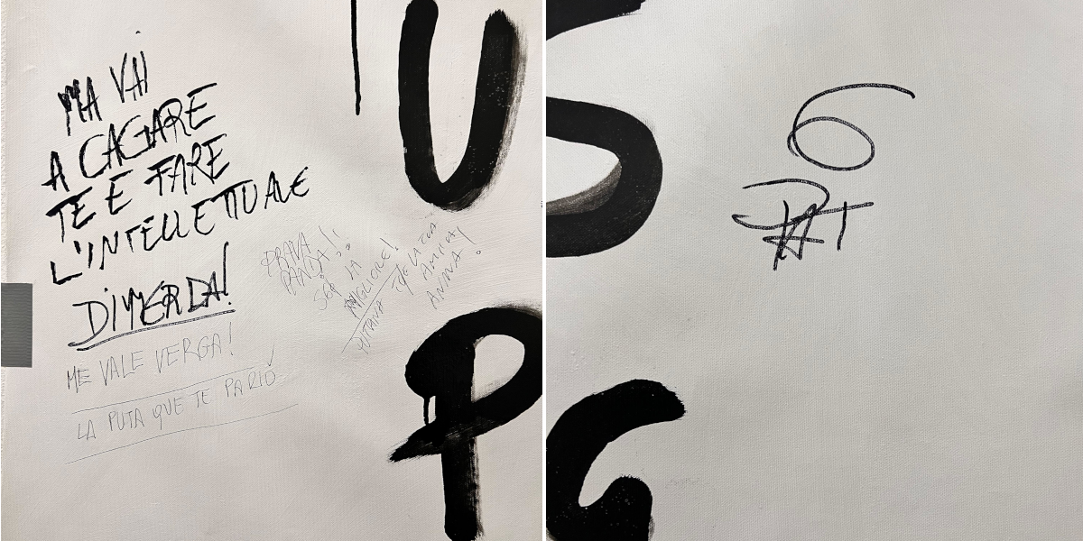Ma accando alle tele appese al muro, che riportano le frasi “A useless painting about love” e “Another useless painting about love”, sono apparse delle scritte ingiuriose nei confronti dell’autore e di alcuni suoi amici.