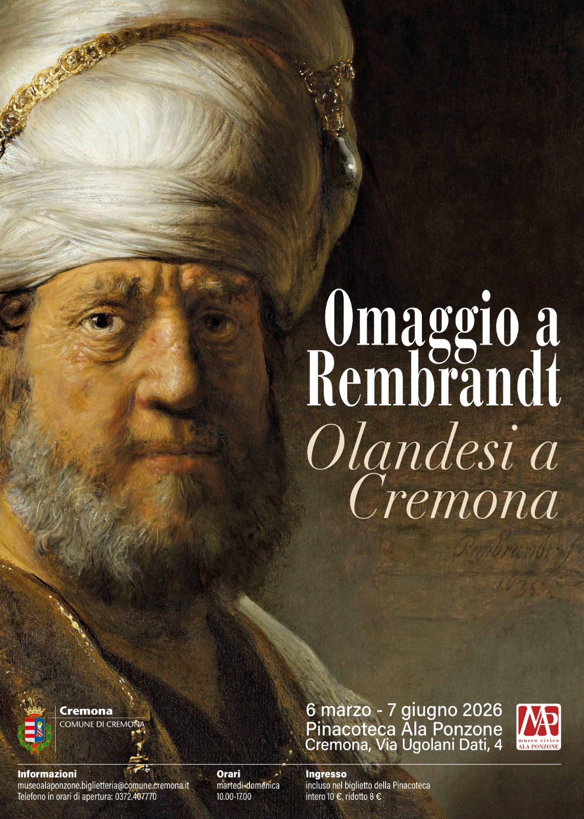 Protagonista dell’esposizione è Rembrandt, uno dei massimi maestri della pittura europea del Seicento. L’iniziativa nasce da un prestigioso scambio tra istituzioni museali: la Pinacoteca Ala Ponzone ha concesso in prestito un’opera di Arcimboldo, ottenendo in cambio l’arrivo a Cremona di un dipinto di Rembrandt, raffigurante un uomo abbigliato all’orientale, soggetto emblematico dell’interesse dell’artista per l’esotismo, la luce e la resa psicologica dei volti.