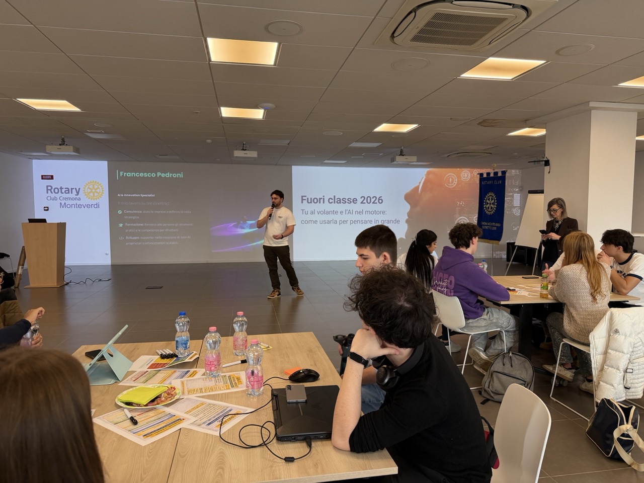 Venticinque studenti delle classi quarte degli istituti IIS Torriani, IIS Ghisleri, Liceo Manin, Liceo Aselli e Liceo Anguissola di Cremona hanno partecipato alla quinta edizione di “Fuori Classe”, il service del Rotary Club Cremona Monteverdi dedicato all’orientamento post diploma. Un’intera giornata di lavoro al CRIT, pensata per accompagnare i ragazzi nella scelta universitaria attraverso il confronto diretto con professionisti e con uno strumento ormai centrale nel mondo del lavoro: l’intelligenza artificiale.