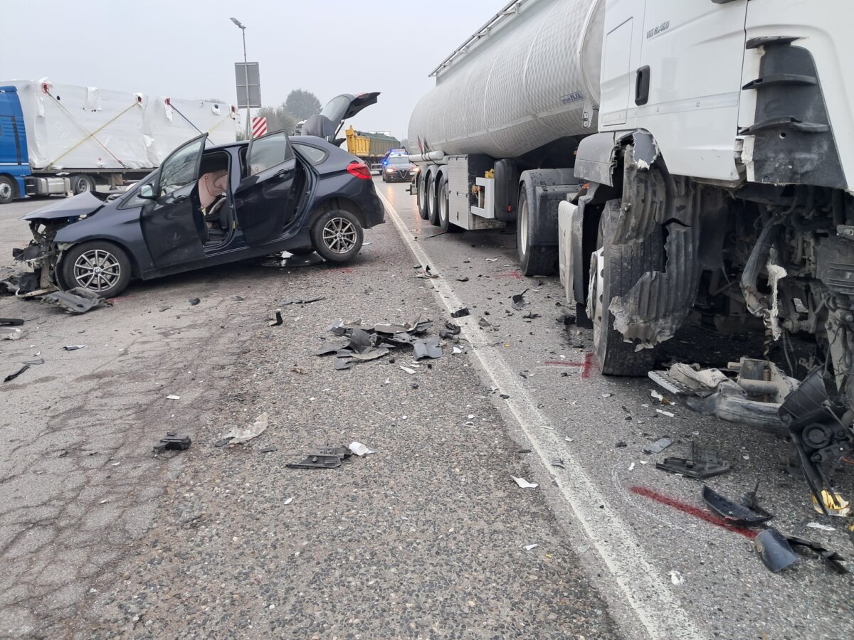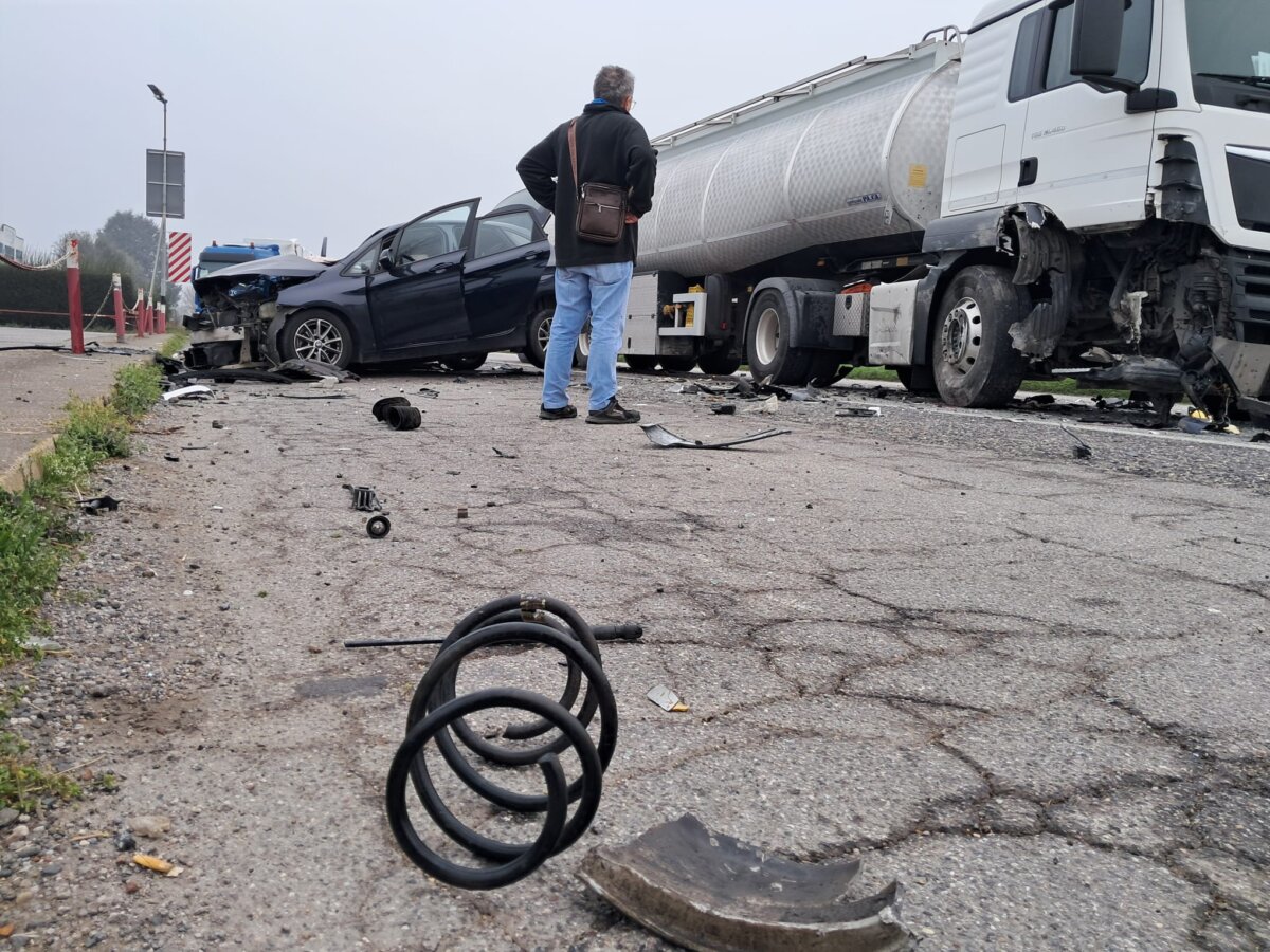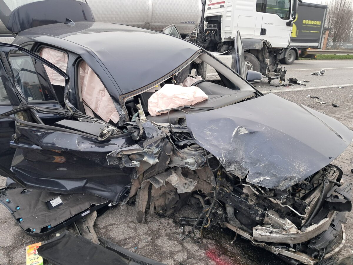 Un’automobile si è schiantata contro un mezzo pesante per cause ancora in corso di accertamento.