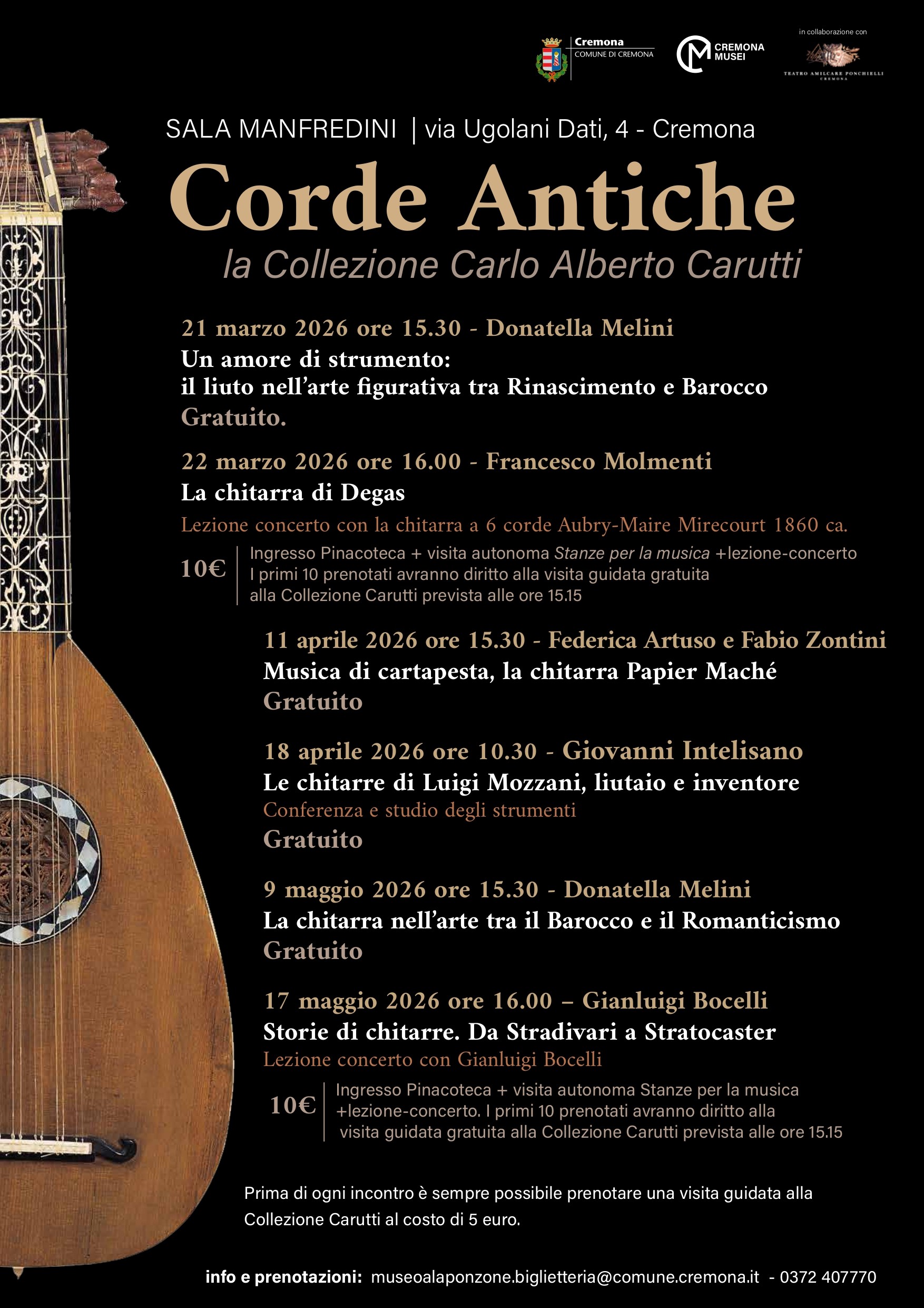 Da sabato 21 marzo a sabato 17 maggio nuovo appuntamento con la rassegna Corde antiche – La Collezione Carlo Alberto Carutti, ideata da Cremona Musei, in collaborazione con il Teatro Ponchielli, per valorizzare la prestigiosa collezione di strumenti antichi in comodato al Museo Civico Ala Ponzone.