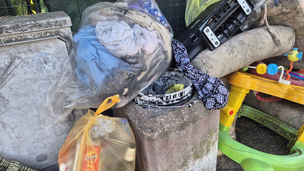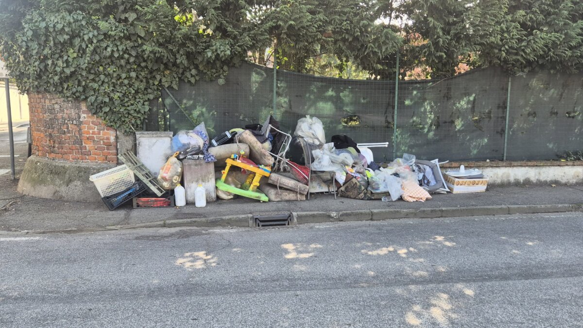 Il cumulo di rifiuti è eterogeneo: non si tratta solo di sacchetti domestici abbandonati impropriamente, ma di un ammasso di scarti di ogni genere. Sul marciapiede si possono scorgere materiali plastici, resti di mobili, strutture in metallo, stoffe, pezzi di legno, contenitori vuoti e via di seguito. Il tutto accatastato selvaggiamente a ridosso del piccolo contenitore in cemento, ormai letteralmente sommerso.