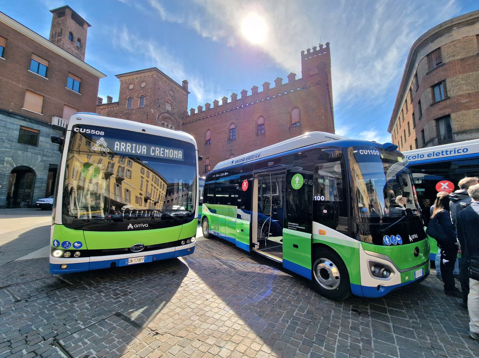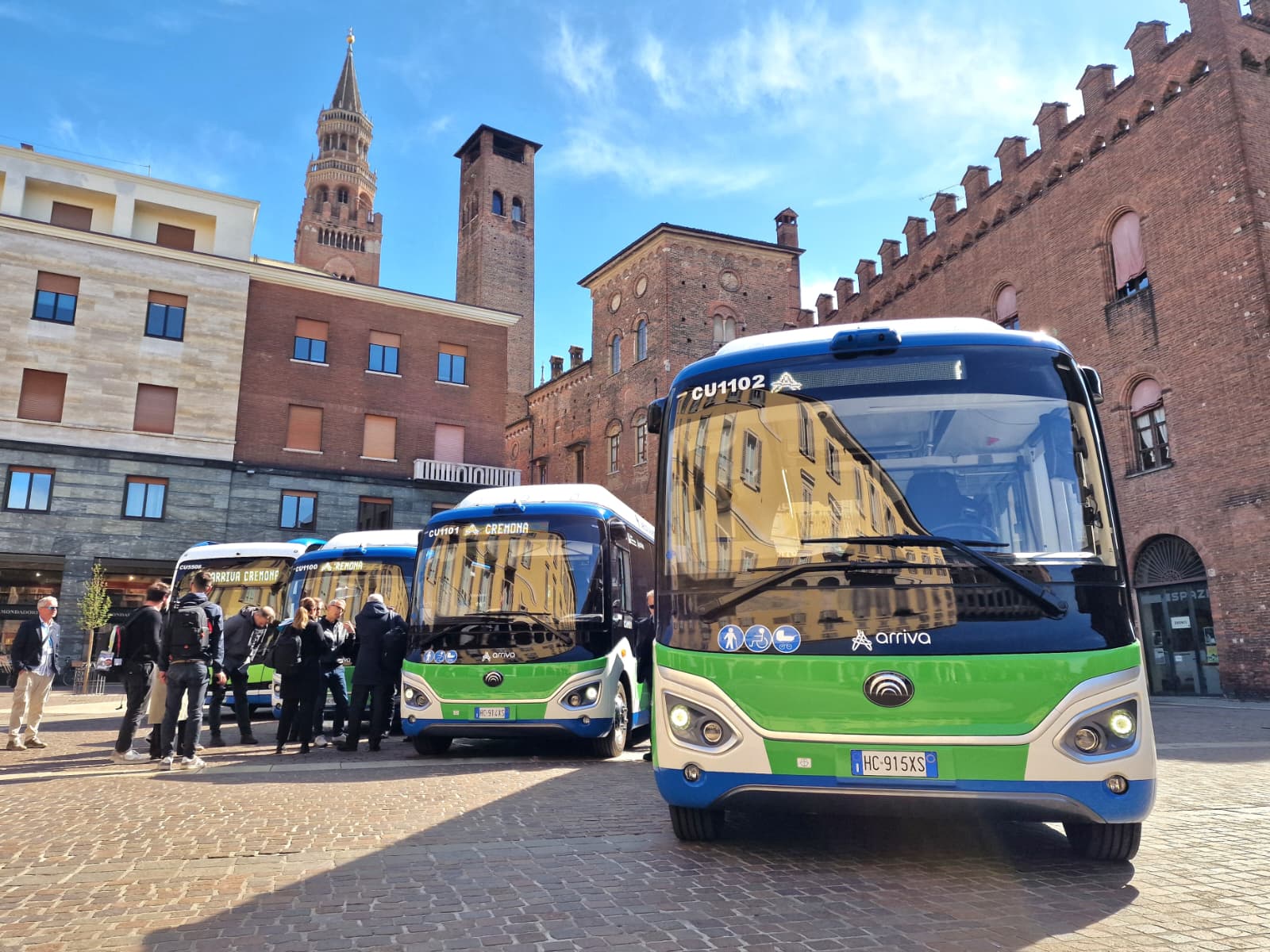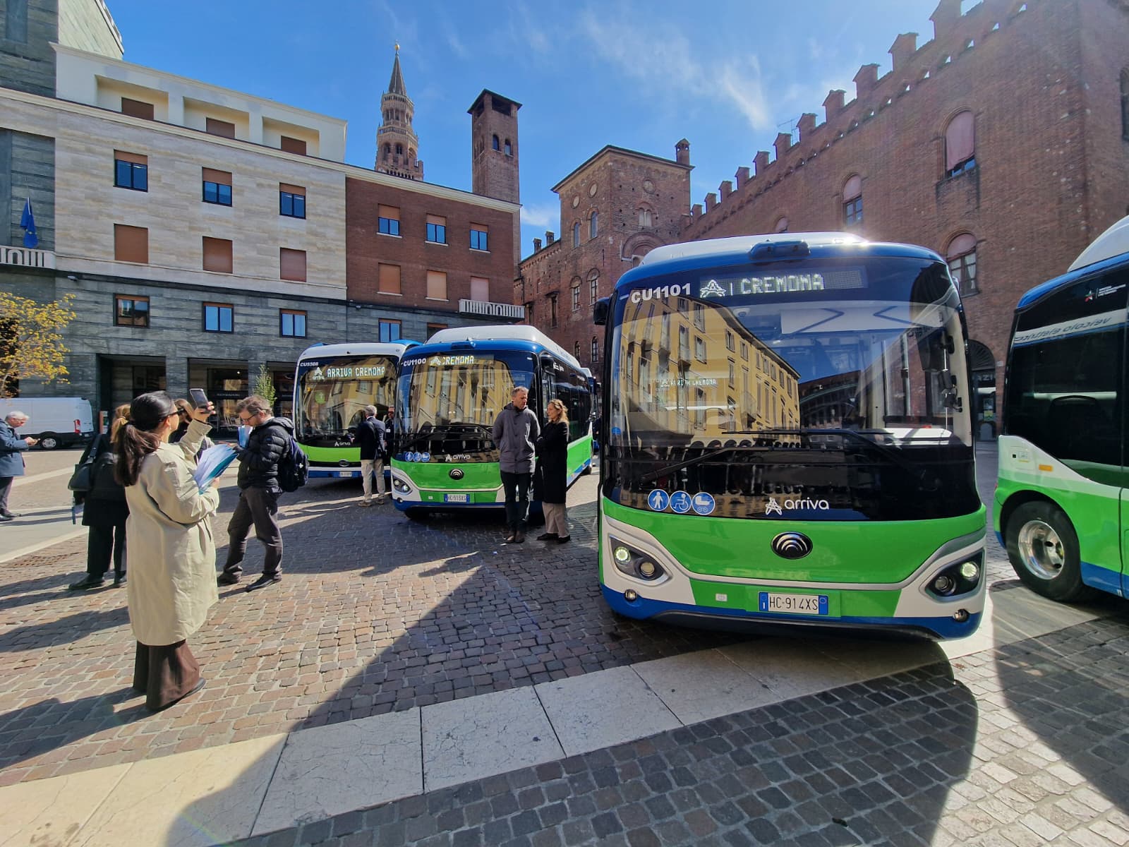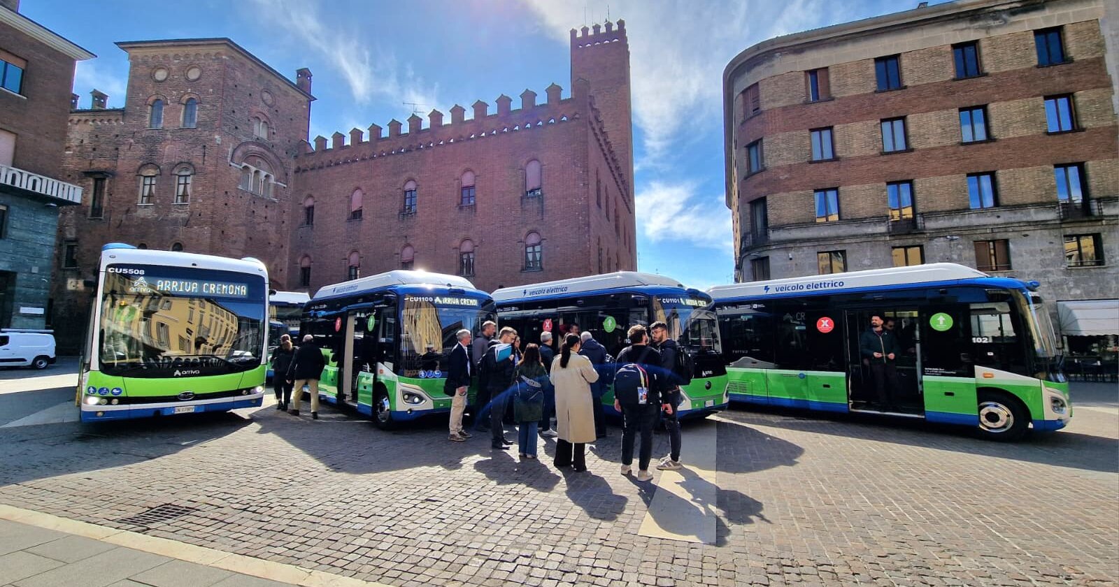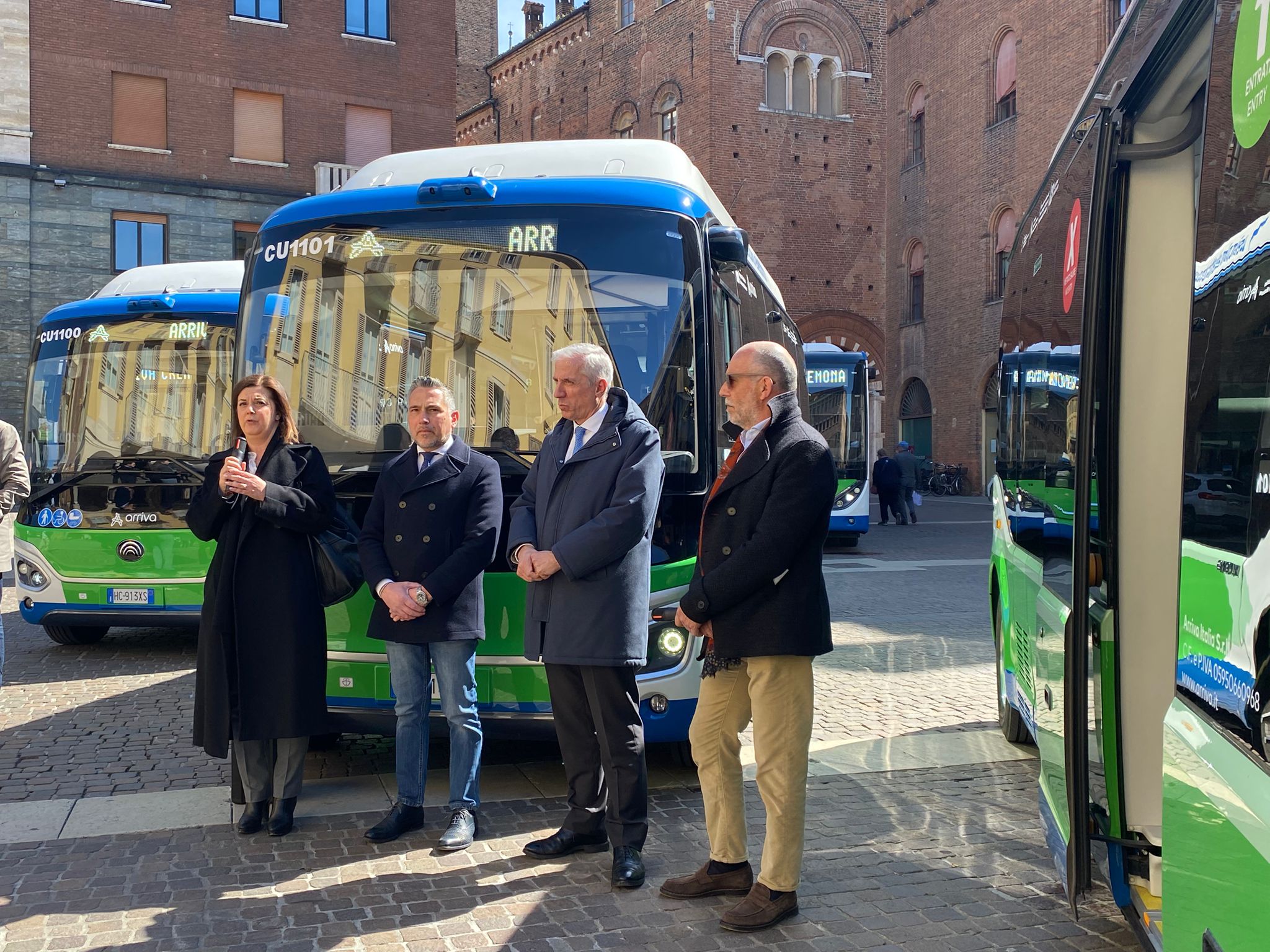 Sono stati presentati oggi, in piazza Stradivari, gli ultimi tre autobus elettrici messi in servizio da Arriva Italia sulla rete di trasporto pubblico del Comune di Cremona e che vanno a completare l’intera flotta elettrica della città. Alla presentazione, dove è stato illustrato anche il nuovo sistema che permette di viaggiare direttamente con la propria carta di pagamento contactless, hanno partecipato Franco Lucente, assessore ai trasporti e mobilità sostenibile di Regione Lombardia, Simona Pasquali, assessora all’Ambiente e Protezione Civile del Comune di Cremona, Angelo Costa, amministratore delegato di Arriva Italia, Franco Ferrada, direttore d’esercizio della sede aziendale di Cremona e rappresentanti dell’Agenzia per il Tpl del bacino di Cremona e Mantova tra cui il nuovo direttore Giulio Biroli, e Mattia Gerevini, consigliere delegato dal Sindaco di Cremona a partecipare all’assemblea dell’Azienda.